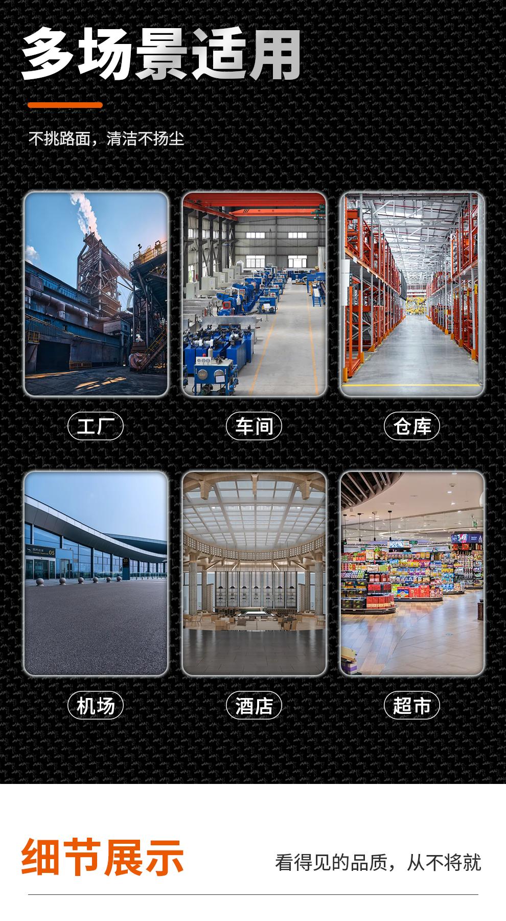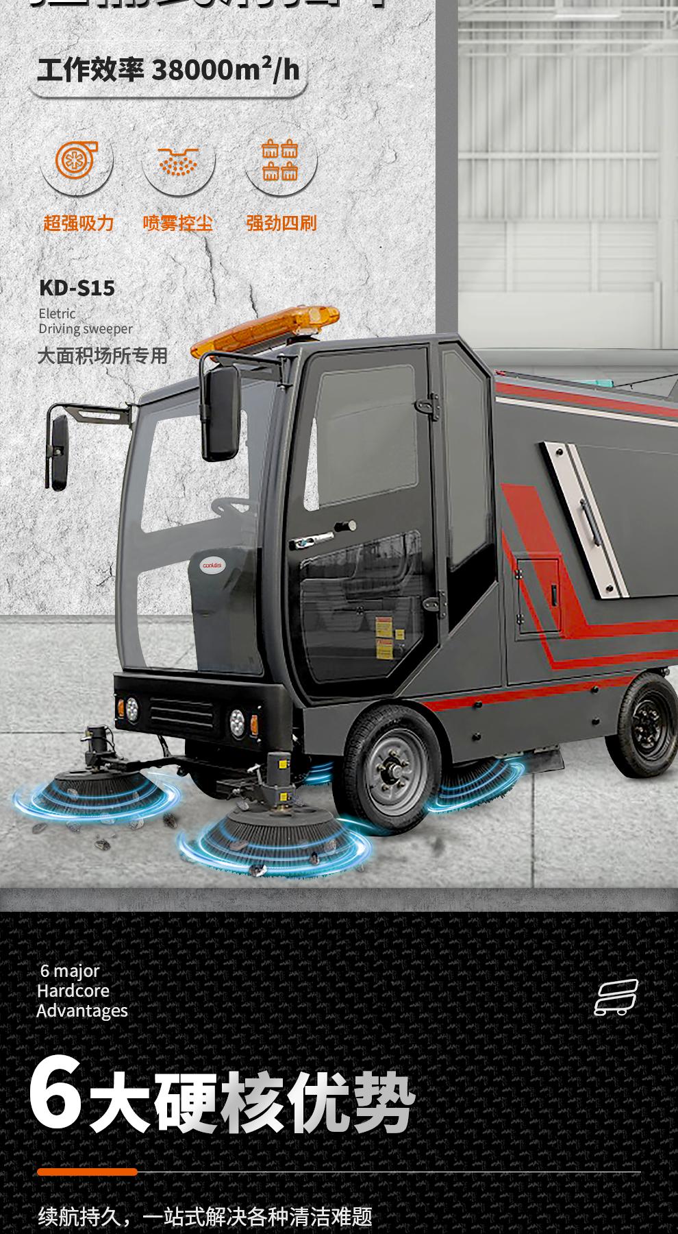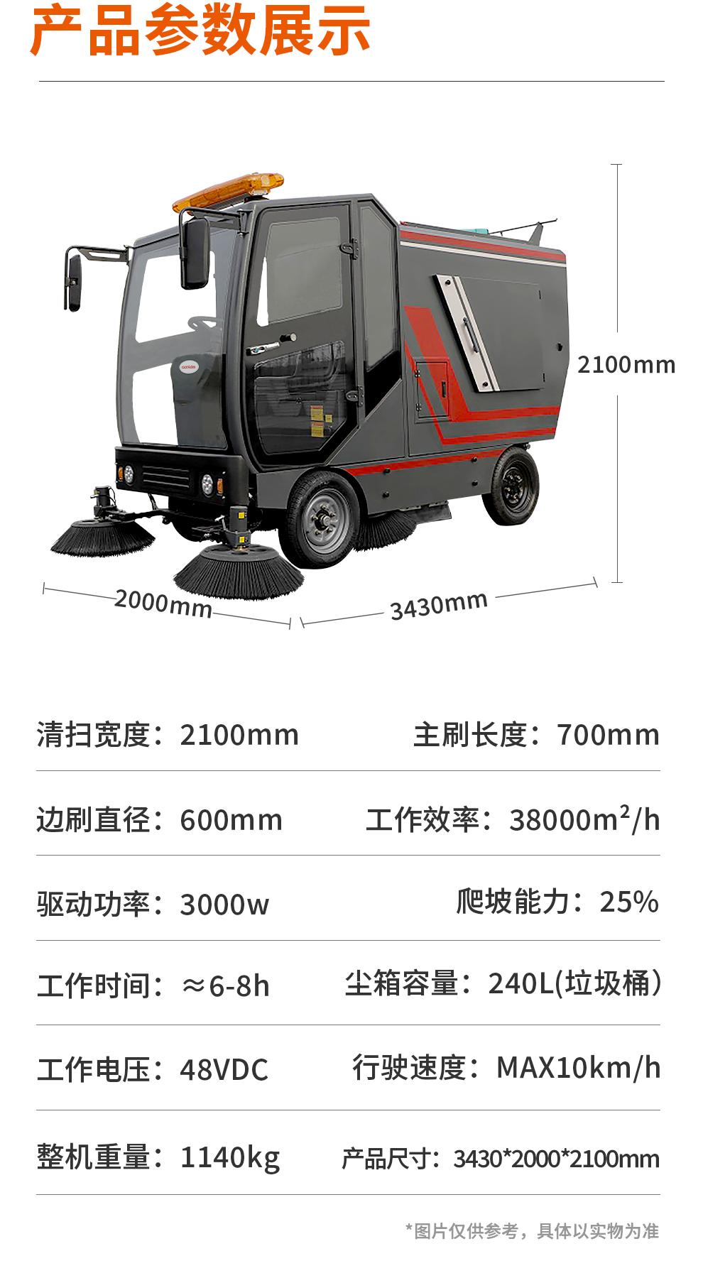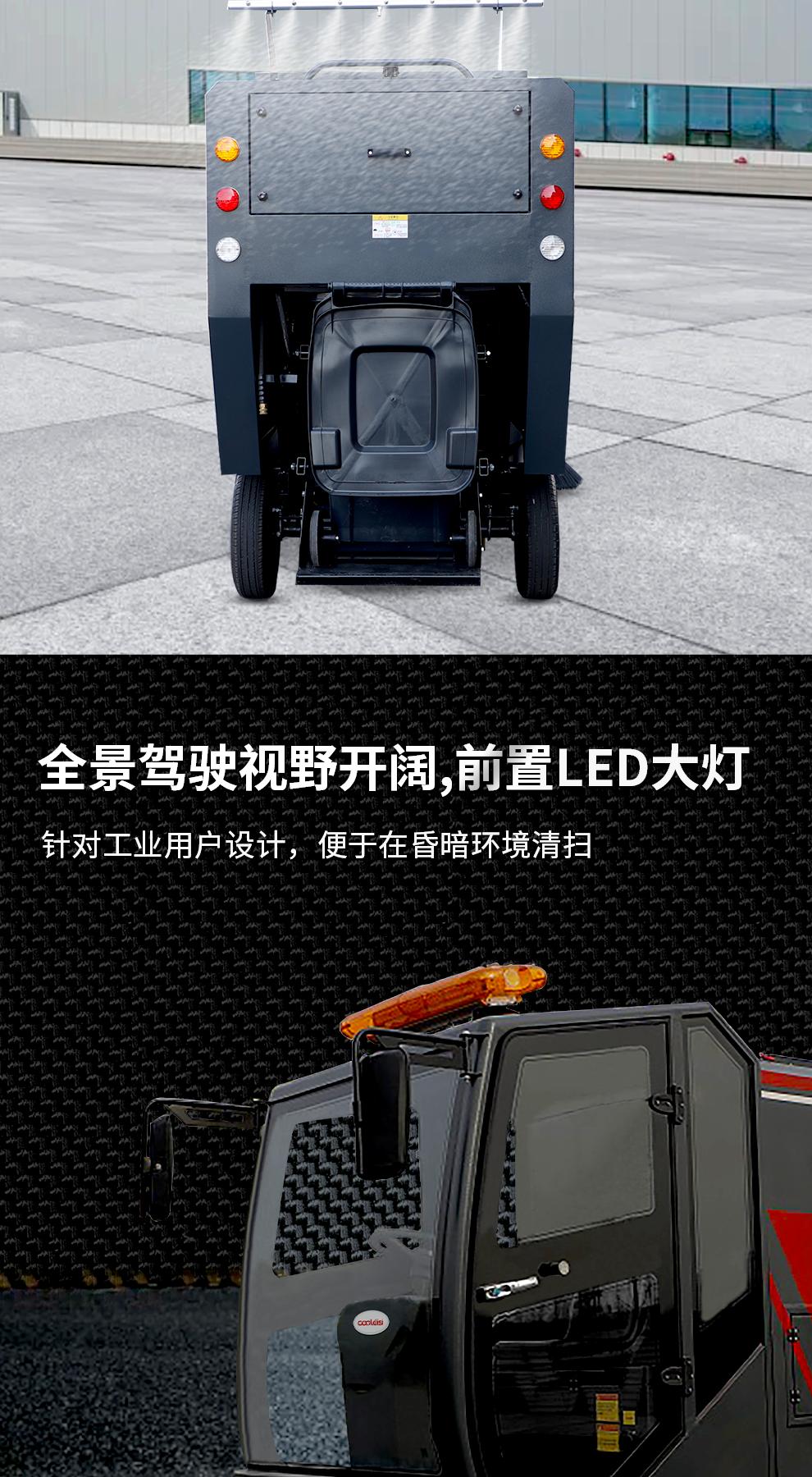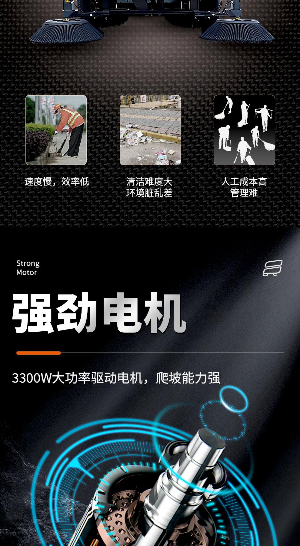 清扫性能:2100mm宽清扫范围,四刷聚尘设计,工作效率高达38000㎡/h,可有效清扫落叶、粉尘、烟头、纸屑等各类轻质垃圾