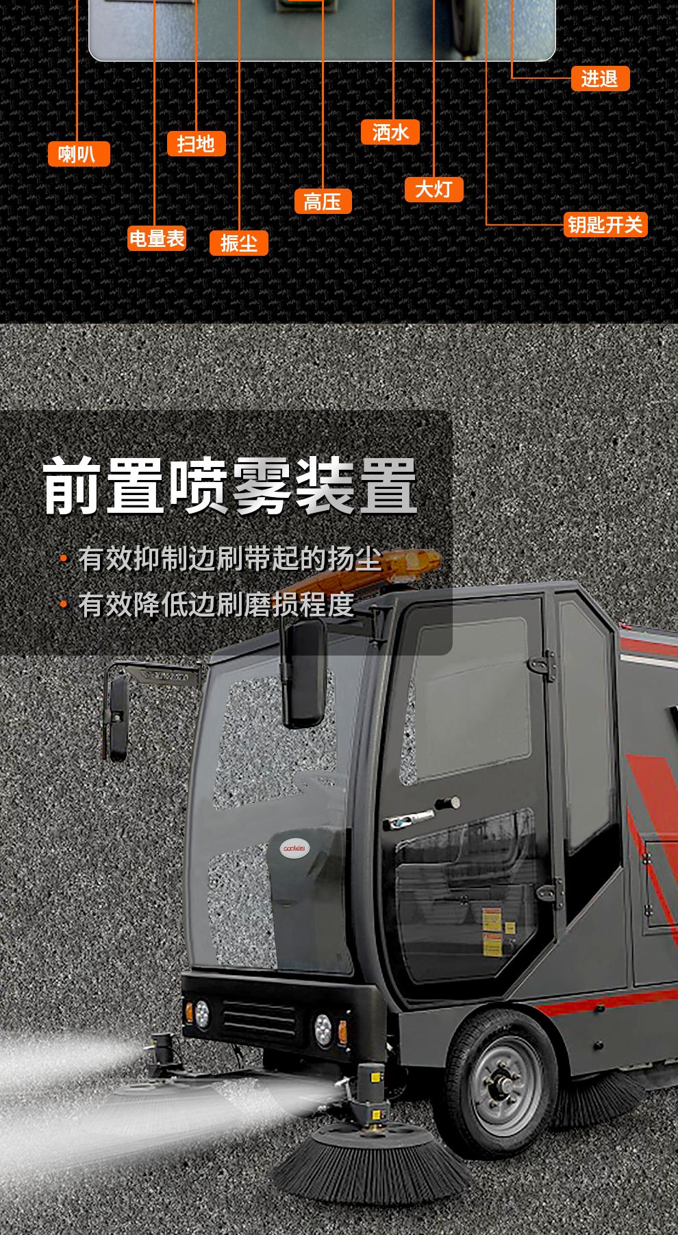 抑尘功能:前置喷雾装置+排冲喷雾系统,配合振尘功能,能显著抑制清扫过程中的扬尘,保持作业环境清洁