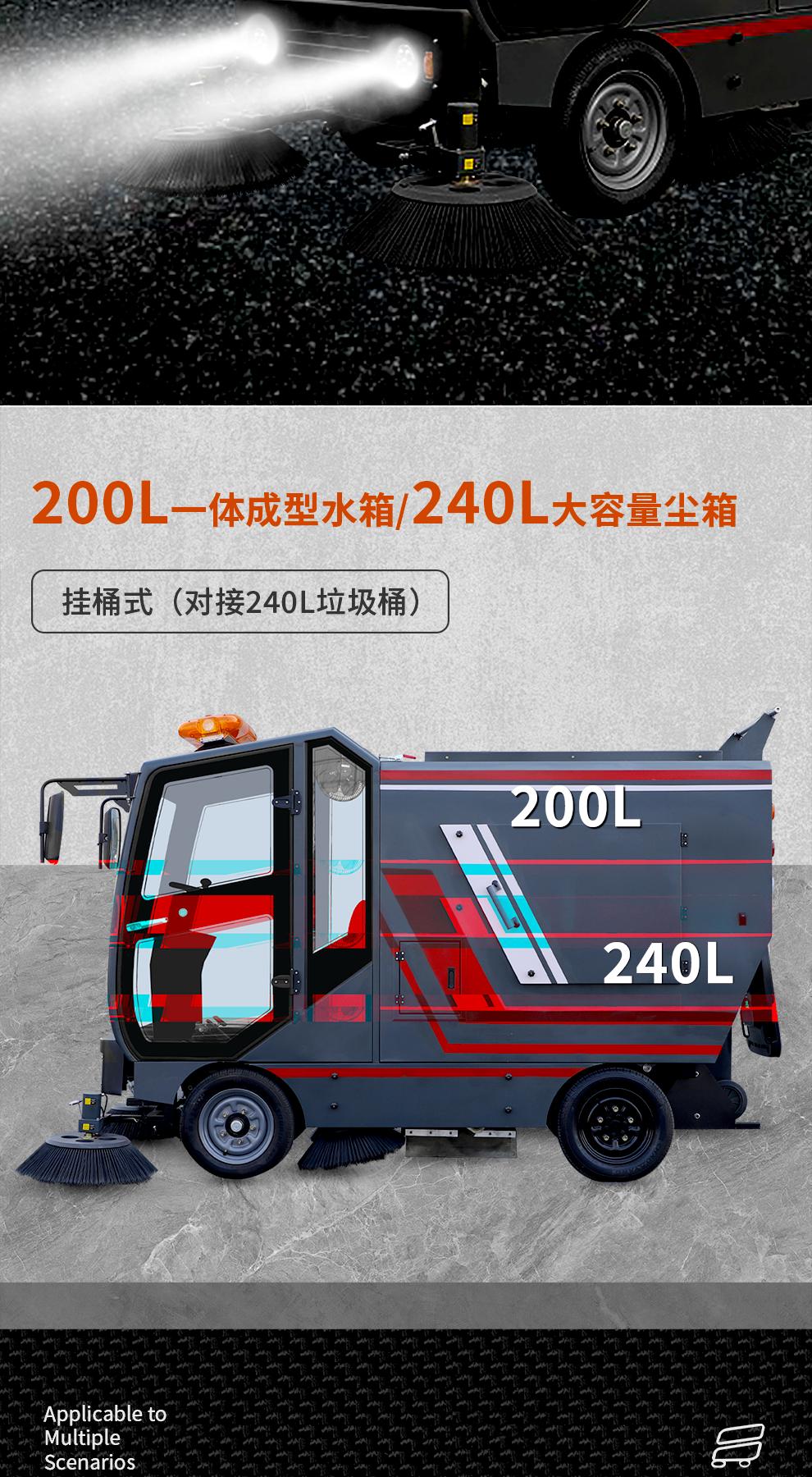 储纳配置:200L一体成型水箱,240L大容量挂桶式尘箱(可对接240L标准垃圾桶),减少频繁倾倒次数