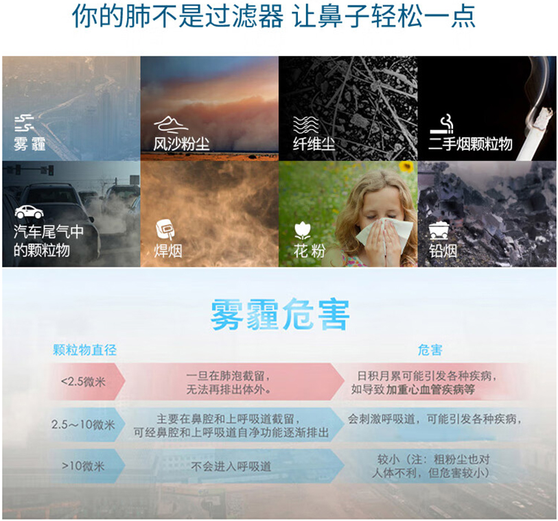 2 日常防护场景:雾霾天气外出、风沙扬尘环境、花粉过敏季节、二手烟密集区域、汽车尾气较多的道路通行、纤维尘较多的场所等