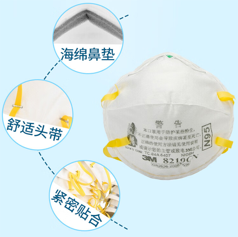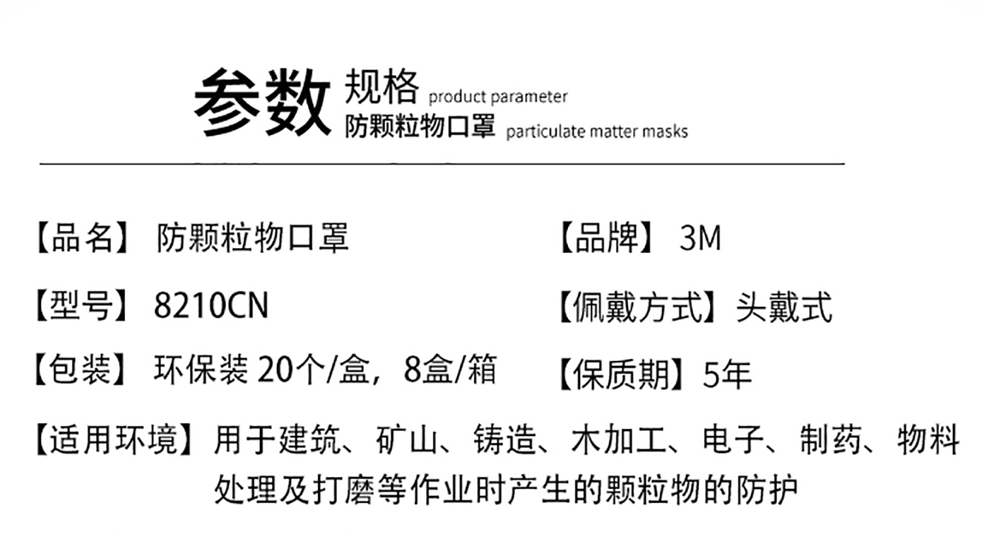 3 包装与规格:环保装,20个/盒,8盒/箱;型号8210CN,品牌3M,保质期5年