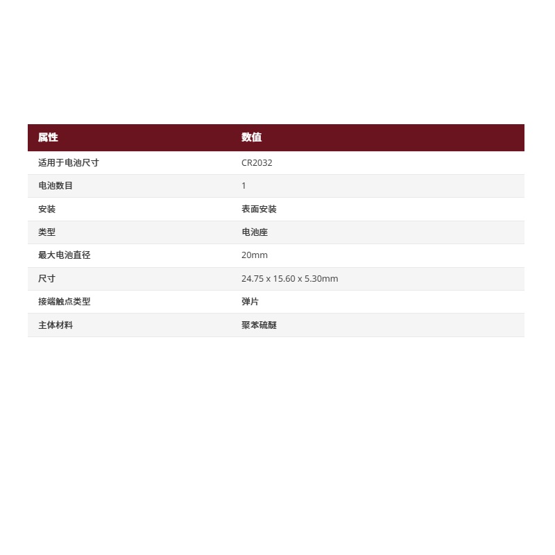 HARWIN CR2032电池座, 表面安装, 1节电池, 弹片触点, 20mm电池直径 rs2479231