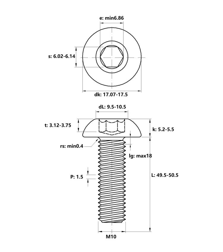 规格为M10*50,螺距1.5mm,头部直径(dk)17.07-17.5mm,头部高度(k)5.2-5.5mm,内六角尺寸(s)6.02-6.14mm,尺寸精度高