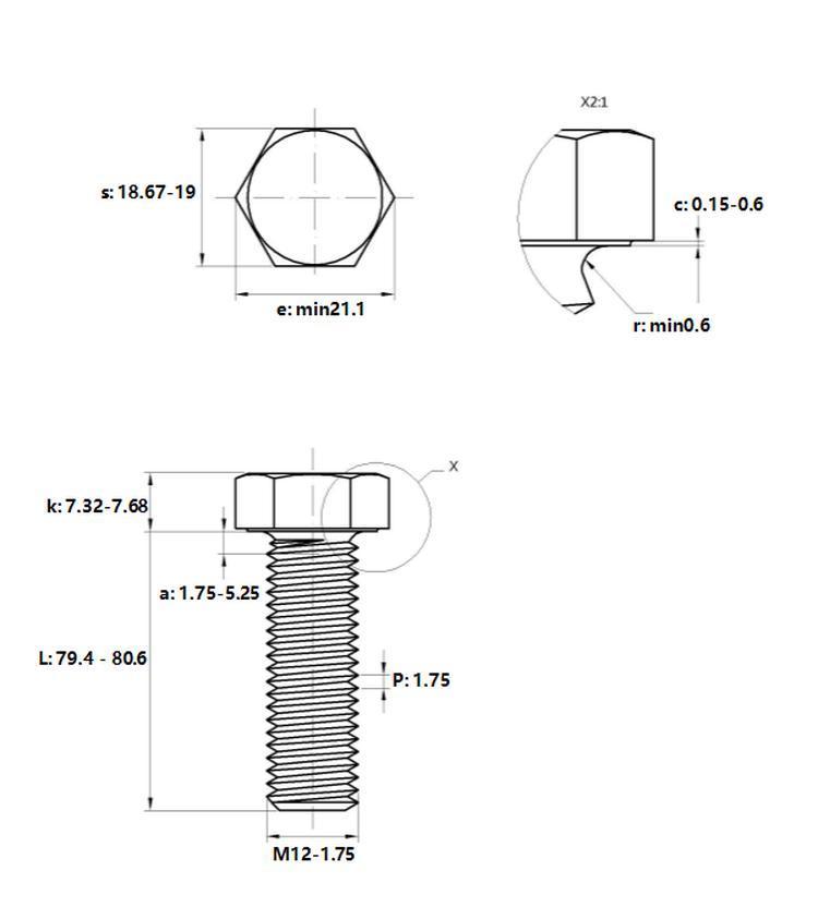 关键尺寸严格控制:六角对边s范围18.67-19mm,最小对角e≥21.1mm,螺杆长度L范围79.4-80.6mm,头部高度k范围7.32-7.68mm