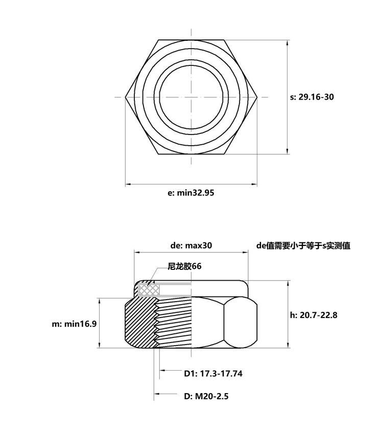 关键尺寸严格符合标准:对边宽度s范围29.16-30mm,对角宽度e最小值32.95mm,螺纹有效长度m最小值16.9mm,整体高度h范围20.7-22.8mm,非金属嵌件直径de最大值30mm