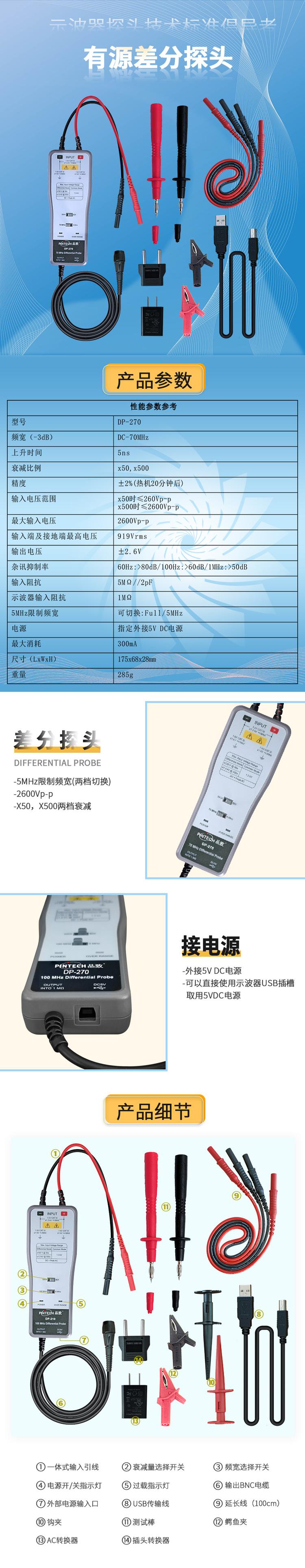 型号DP-270,有源差分探头,带宽覆盖DC-70MHz,上升时间5ns,信号响应快速