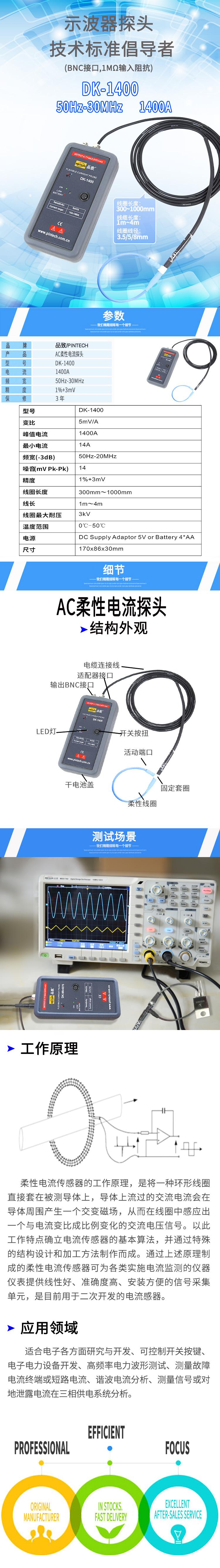 Pintech品致DK-1400罗氏线圈柔性电流探头14A-1400A参数可定制