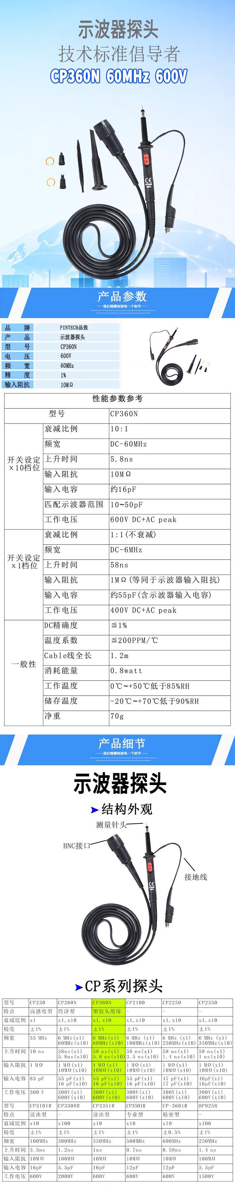 Pintech品致10X衰减无源示波器探头CP360N(60MHz 600V)