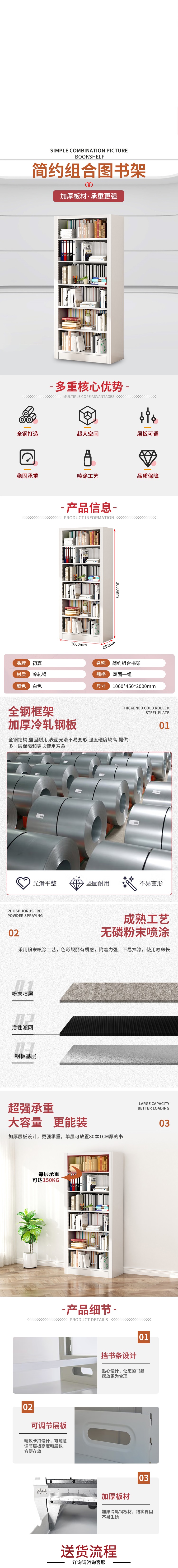 结构实用:6层双面设计,超大存储空间;层板可调节高度,满足不同尺寸书籍或物品存放需求;配备挡书条,防止书籍滑落,摆放更整齐