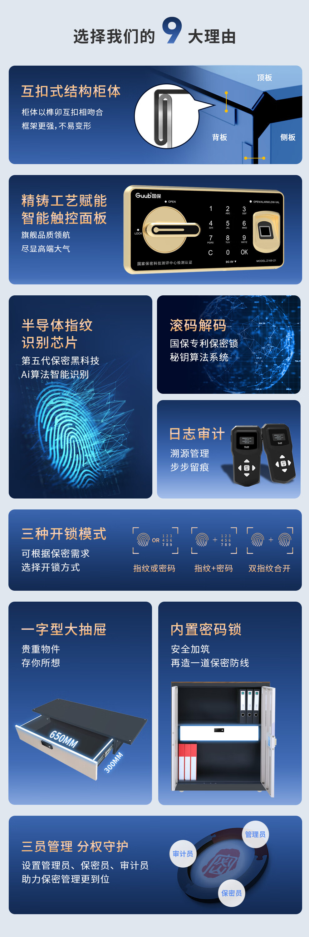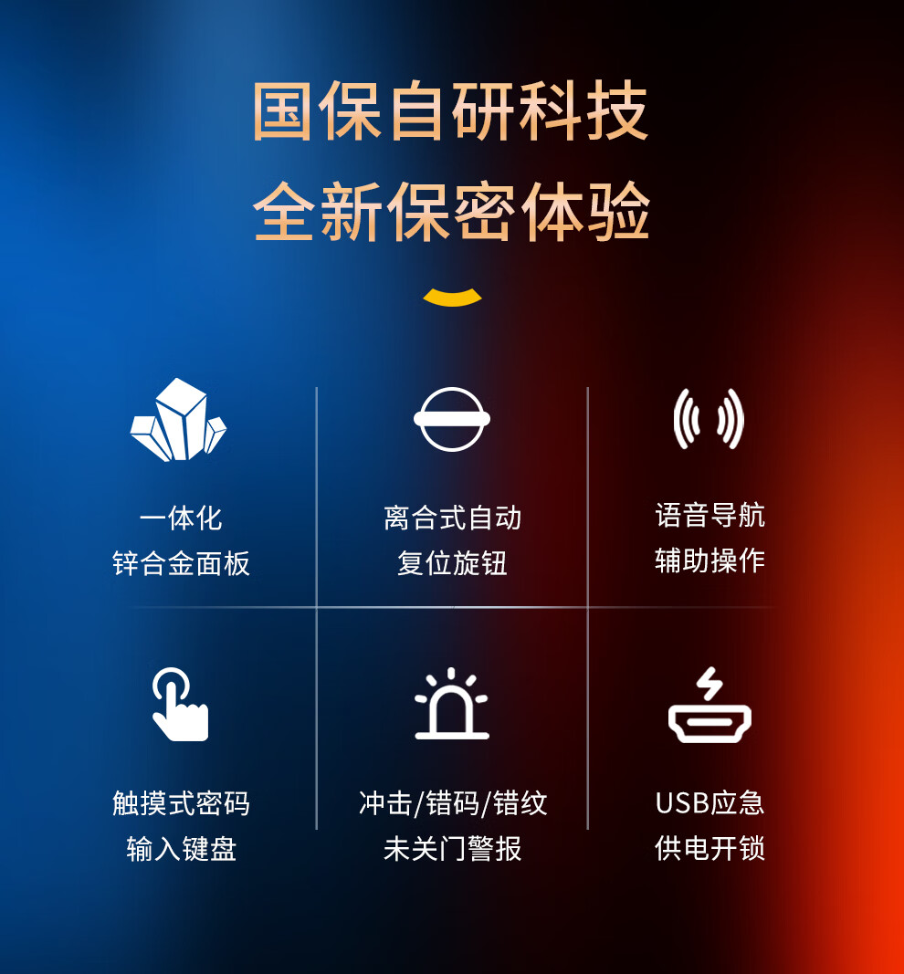 优质材质与工艺:采用SPCC冷轧钢板,钢板裸厚≥1.0mm;智能触控面板,精铸工艺尽显高端;防爆空转离合防暴力拆锁,三向四点锁定安全可靠