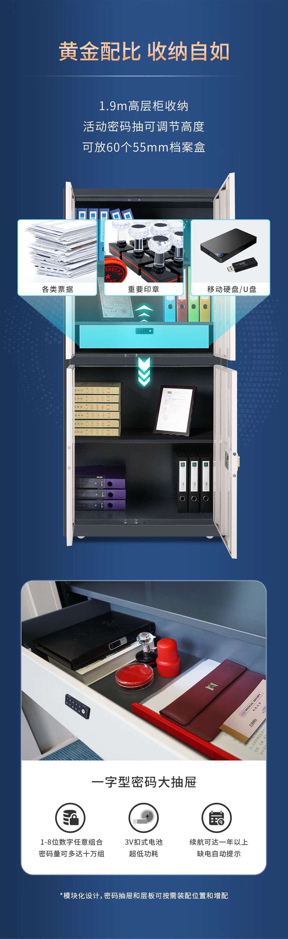 实用配置:内置一字型密码大抽屉(1-8位数字密码,续航可达一年以上),活动层板可调节,配备应急供电接口、耐磨尼龙脚轮、低音防撞胶垫