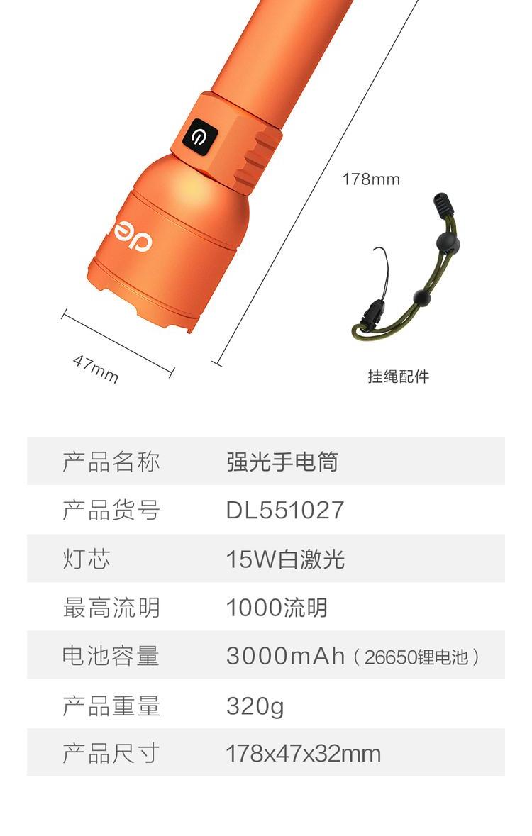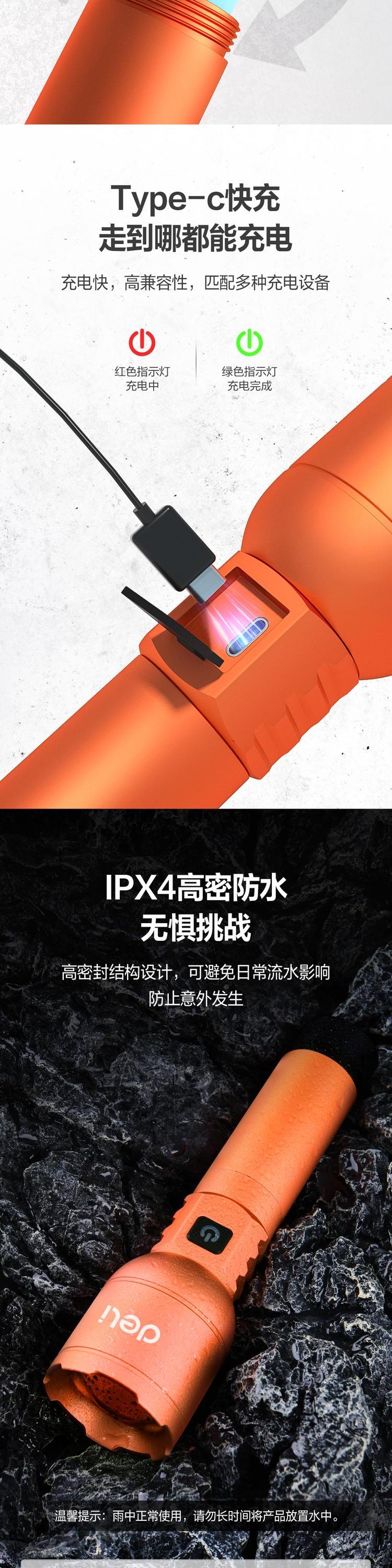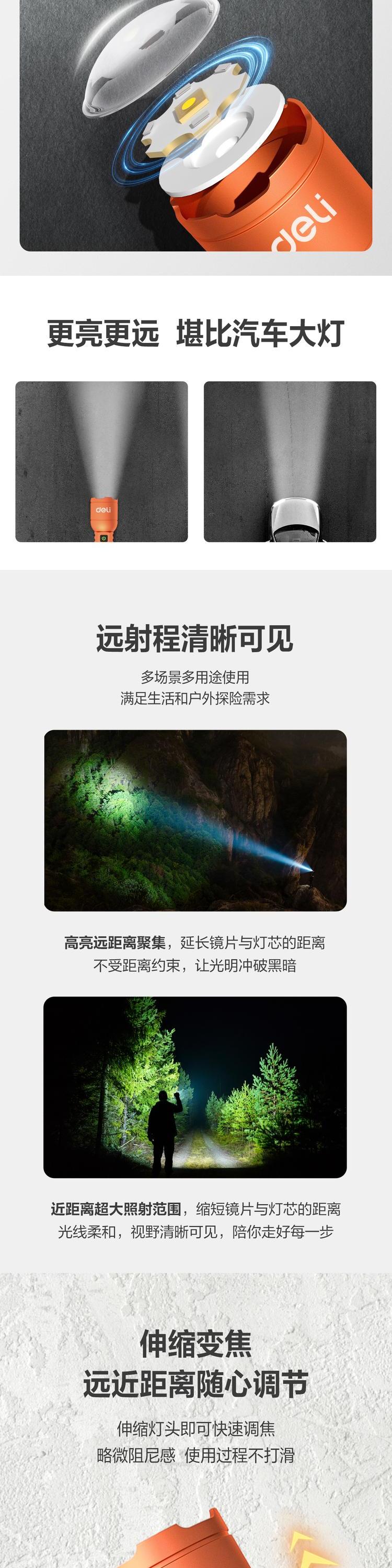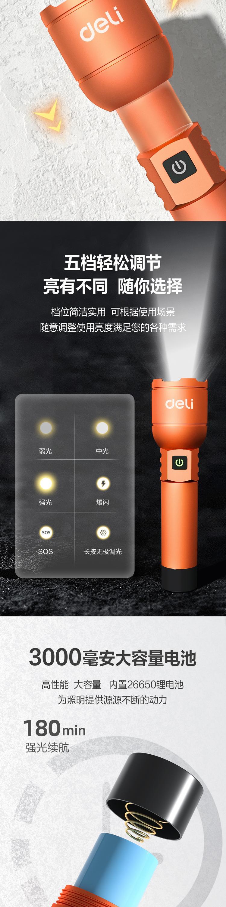 deli得力DL551027手电筒1000lm3000mAh变焦反充(橙)(个)