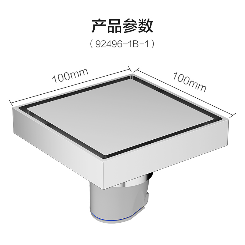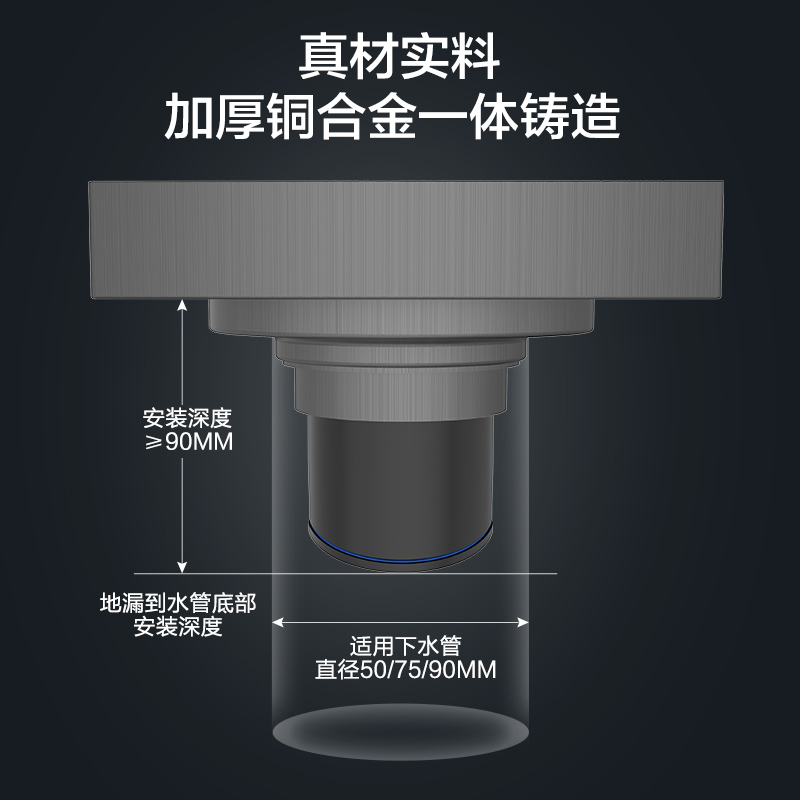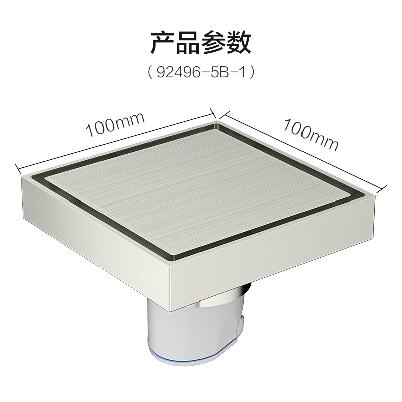 8 适配参数:适用下水管直径50/75/90mm,安装深度需≥90mm;面板尺寸为100mm×100mm