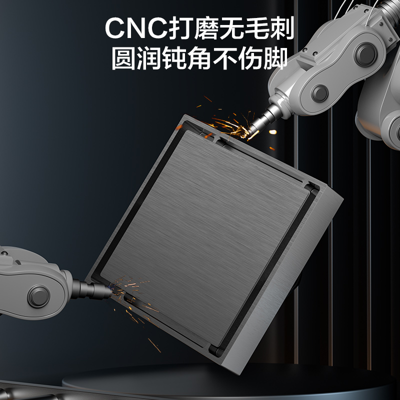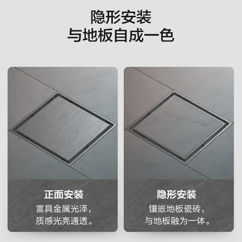 4 安装设计:支持正反两用,正面安装呈现金属光泽,隐形安装可镶嵌地板瓷砖,与地面融为一体,提升空间美观性