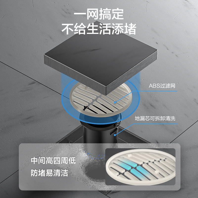 6 易清洁设计:配备ABS过滤网,地漏芯可拆卸清洗;过滤网采用中间高四周低造型,防堵且便于清理杂物