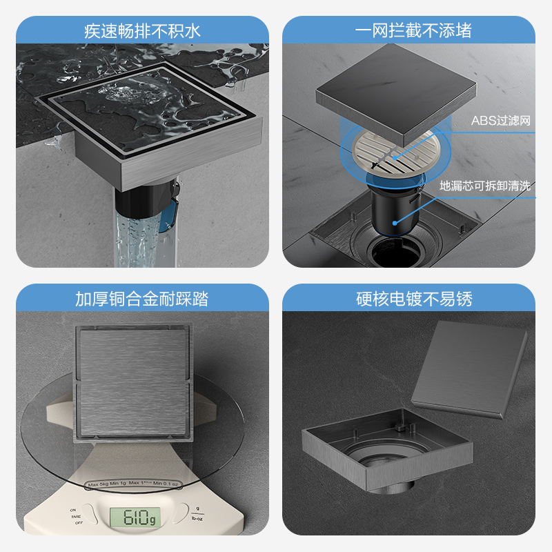 3 防臭防虫功能:磁推三防地漏芯,通过磁铁互斥原理配合强密度软硅胶密封结构,有效隔绝管道异味与蚊虫进入