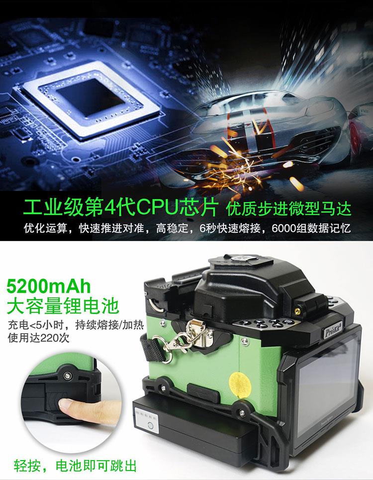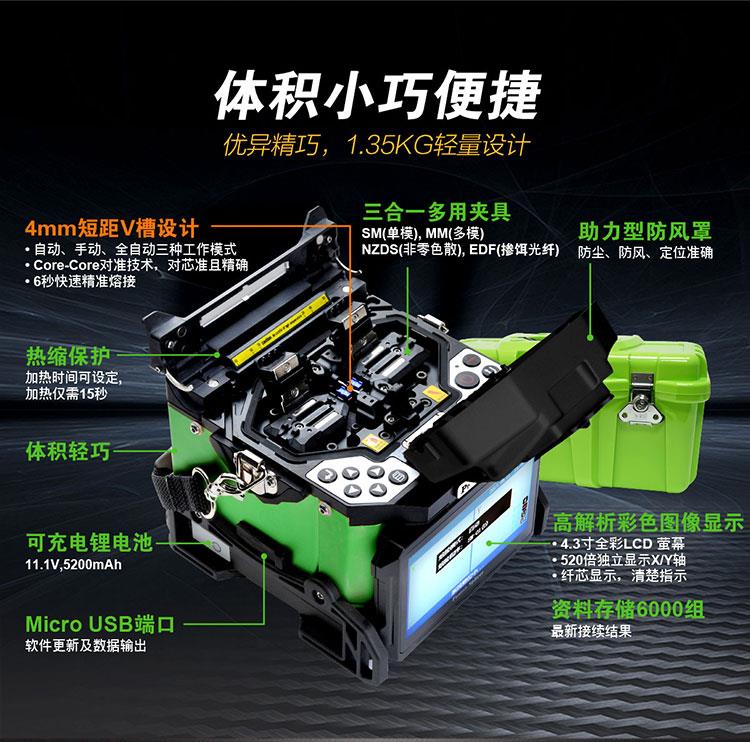 5 大容量电池与便携性:5200mAh锂电池,充电<5小时可连续熔接/加热220次;机身小巧,不含电池仅1.35kg,便于携带