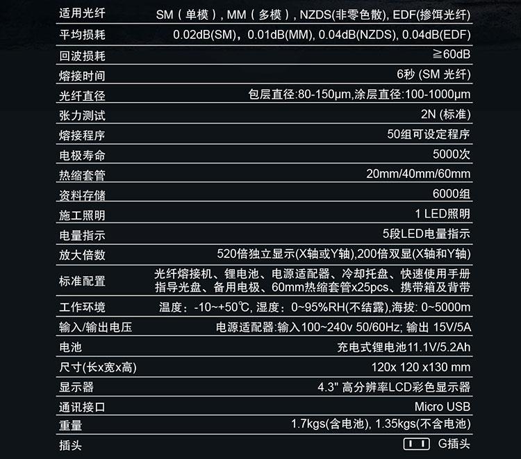 1 采用纤芯对准技术,熔接损耗低:单模(SM)平均损耗0.02dB,多模(MM)0.01dB,非零色散(NZDS)和掺铒光纤(EDF)均为0.04dB,回波损耗≥60dB