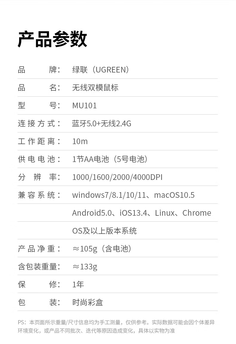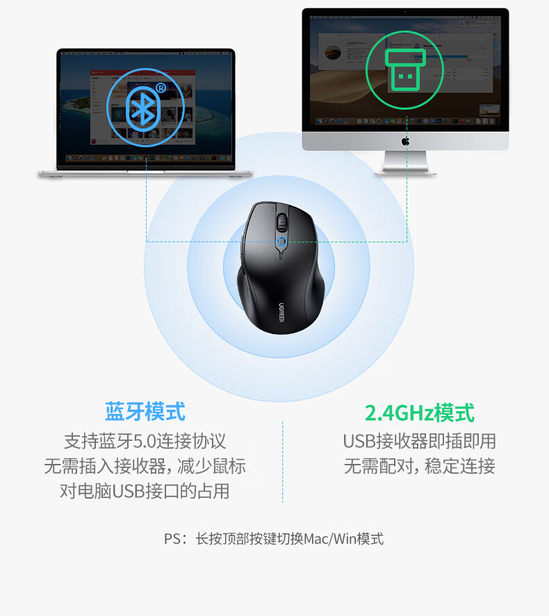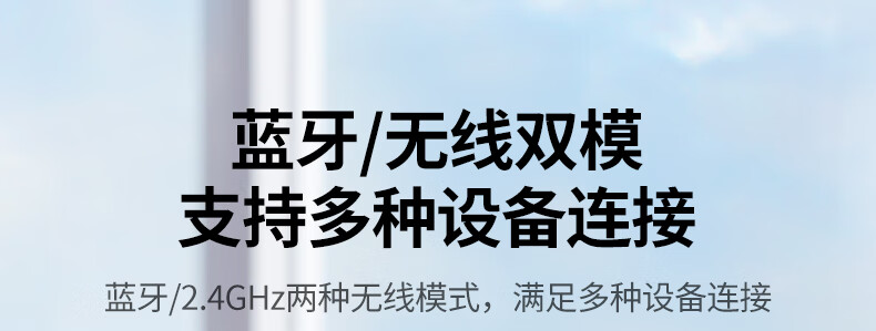 双模连接:支持蓝牙5.0和2.4G无线连接,蓝牙模式无需接收器节省USB接口,2.4G模式即插即用稳定可靠,工作距离可达10米