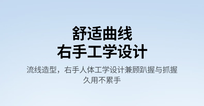 人体工学右手造型:流线曲线贴合手部,侧翼硅胶指托防滑舒适,久用不累