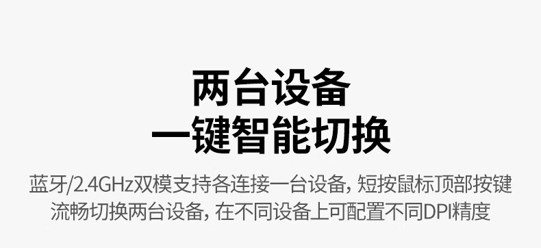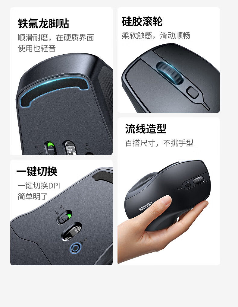细节配置:铁氟龙脚贴顺滑耐磨,硅胶滚轮触感柔软,一键切换设备与模式