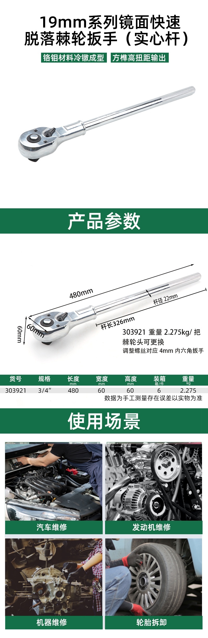 长鹿 19mm系列镜面快速脱落棘轮扳手(实心杆) 303921