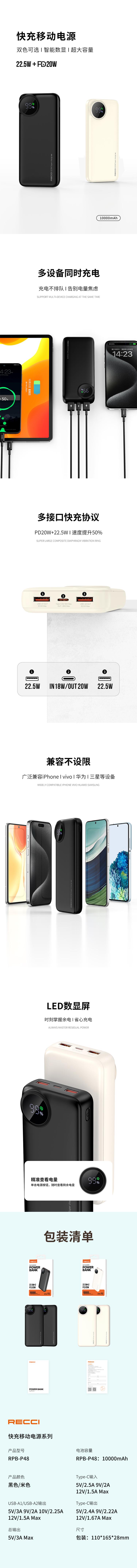 品牌为Recci(锐思),型号RPB - P48,电池容量10000mAh,支持22.5W快充+PD20W快充协议,充电速度快,可满足快速补电需求;