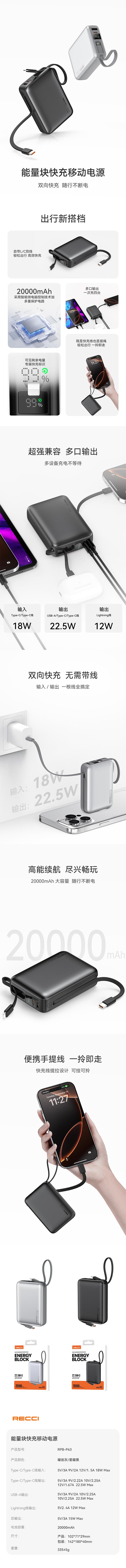 RECCI RPB-P63(3C)能量块快充移动电源星耀黑
