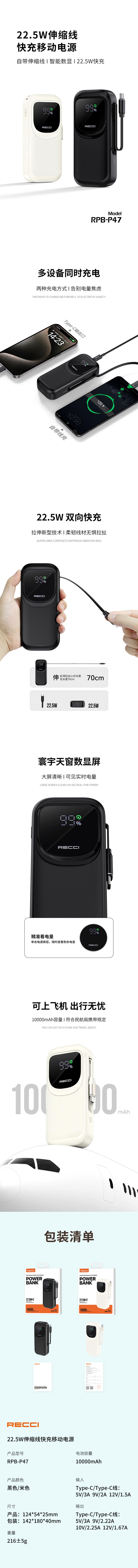RECCI 22.5W伸缩线10000mAh快充移动电源RPB-P47黑色