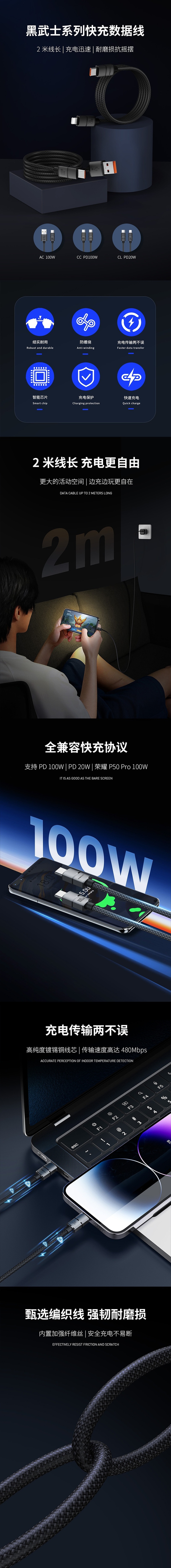 5 线长设计:线长200cm(2米),活动空间大,居家、办公、游戏时边充边玩更自在,适配多种场景的空间需求