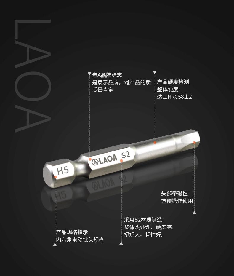 本款LAOA(老A) LA619H25内六角批头采用S2合金钢材质制造,经过整体热处理工艺,硬度达到HRC58±2,具备高强度、高耐磨性和优异的抗扭性能,适用于高扭矩作业环境。