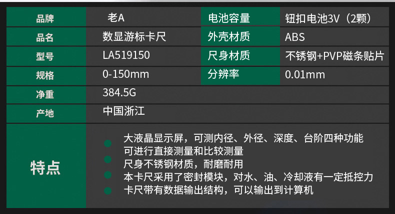 测量性能:测量范围0 - 150mm,分辨率0.01mm,测量精准,支持公英制单位转换,可满足多种精度测量需求