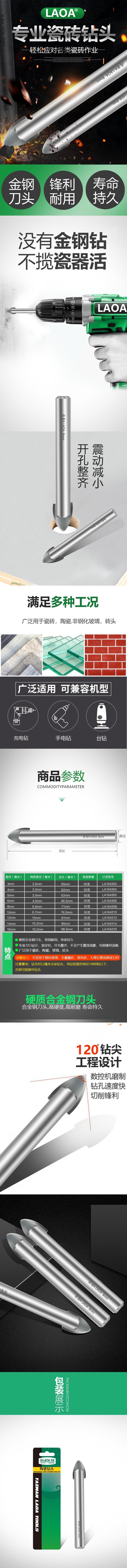 本款LAOA(老A)圆柄陶瓷钻头采用硬质合金钢刀头设计,具有高硬度、高耐磨性,确保在长时间使用中保持锋利,延长使用寿命。钻头前端采用120°钻尖工程设计,经数控机床精密磨制,切削效率高,钻孔速度快,能有效减少钻孔过程中的阻力和热量积累。钻头整体结构紧凑,专业刀口设计便于精准定位,开孔整齐,避免出现震动或崩边现象。适用于多种材质的打孔作业,包括瓷砖、陶瓷、非钢化玻璃及砖头等常见建材。钻头柄部为标准圆柄设计,兼容性强,可适配充电钻、手电钻及台钻等多种电动工具,满足不同工况需求。表面经过精细处理,具备良好的抗腐蚀性能,适合长期存放与反复使用。