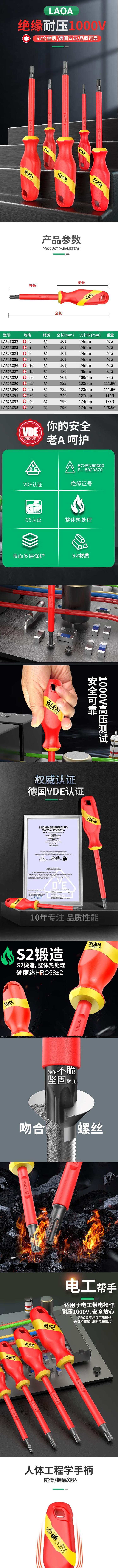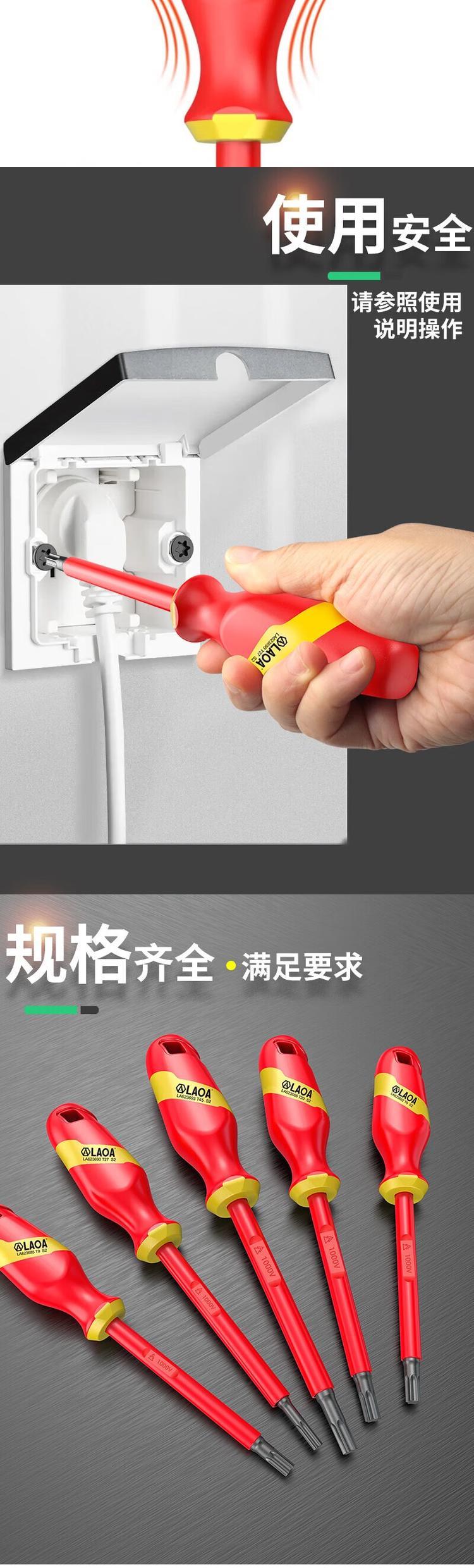 本款LAOA(老A)双色绝缘注塑花型螺丝批T10(型号:LA623686)采用S2合金钢材质,经过整体热处理工艺,硬度高达HRC58±2,具有优异的抗扭强度和耐磨损性能,确保在高强度作业中不易变形或断裂。