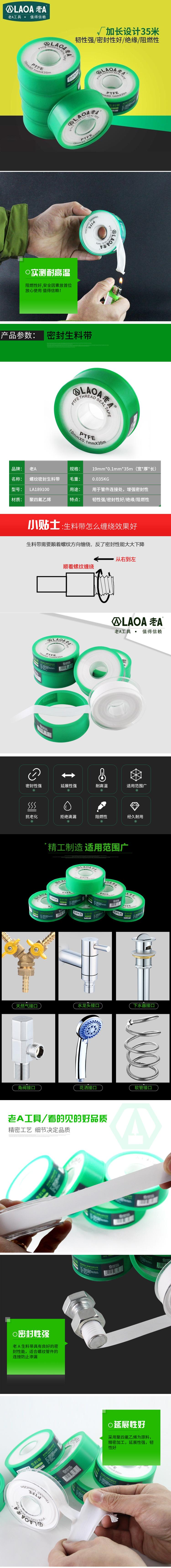 LAOA(老A)生料带采用聚四氟乙烯(PTFE)材料制成,具有优异的密封性能和耐化学腐蚀性。产品规格为19mm宽、0.1mm厚、35m长,适用于多种管道连接场景。其韧性高、延展性好,能够紧密贴合螺纹表面,有效防止泄漏。产品具备良好的耐高温性能,可在-200℃至+260℃范围内稳定工作,适合在复杂工况下使用。此外,该生料带还具有阻燃性、抗老化、拒水防潮等特性,确保长期使用不褪色、不变形。包装设计紧凑,便于携带与储存,绿色外包装清晰标识产品信息,提升辨识度。