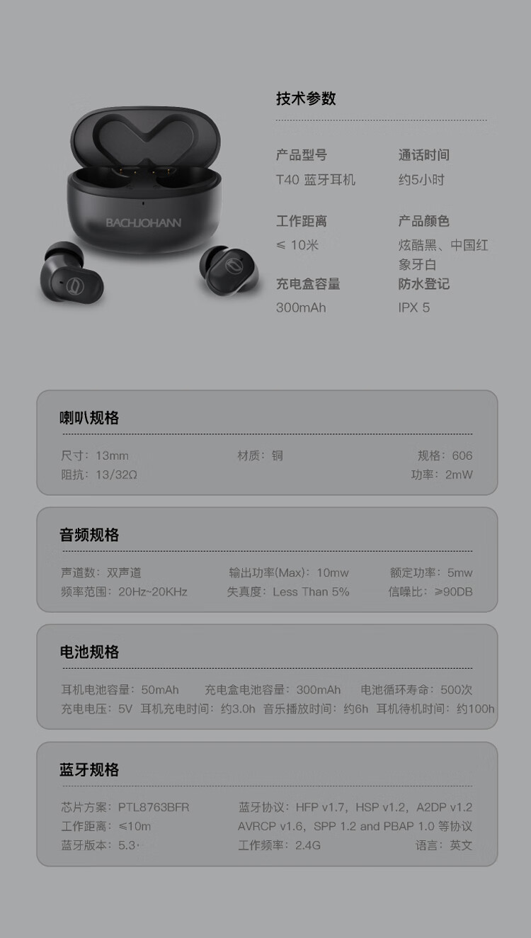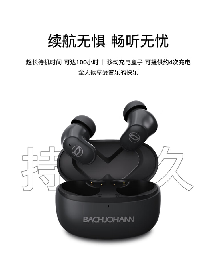 续航能力:耳机单次音乐播放约6小时,通话约5小时;充电仓300mAh可充约3次,总续航约20小时,待机时长100小时
