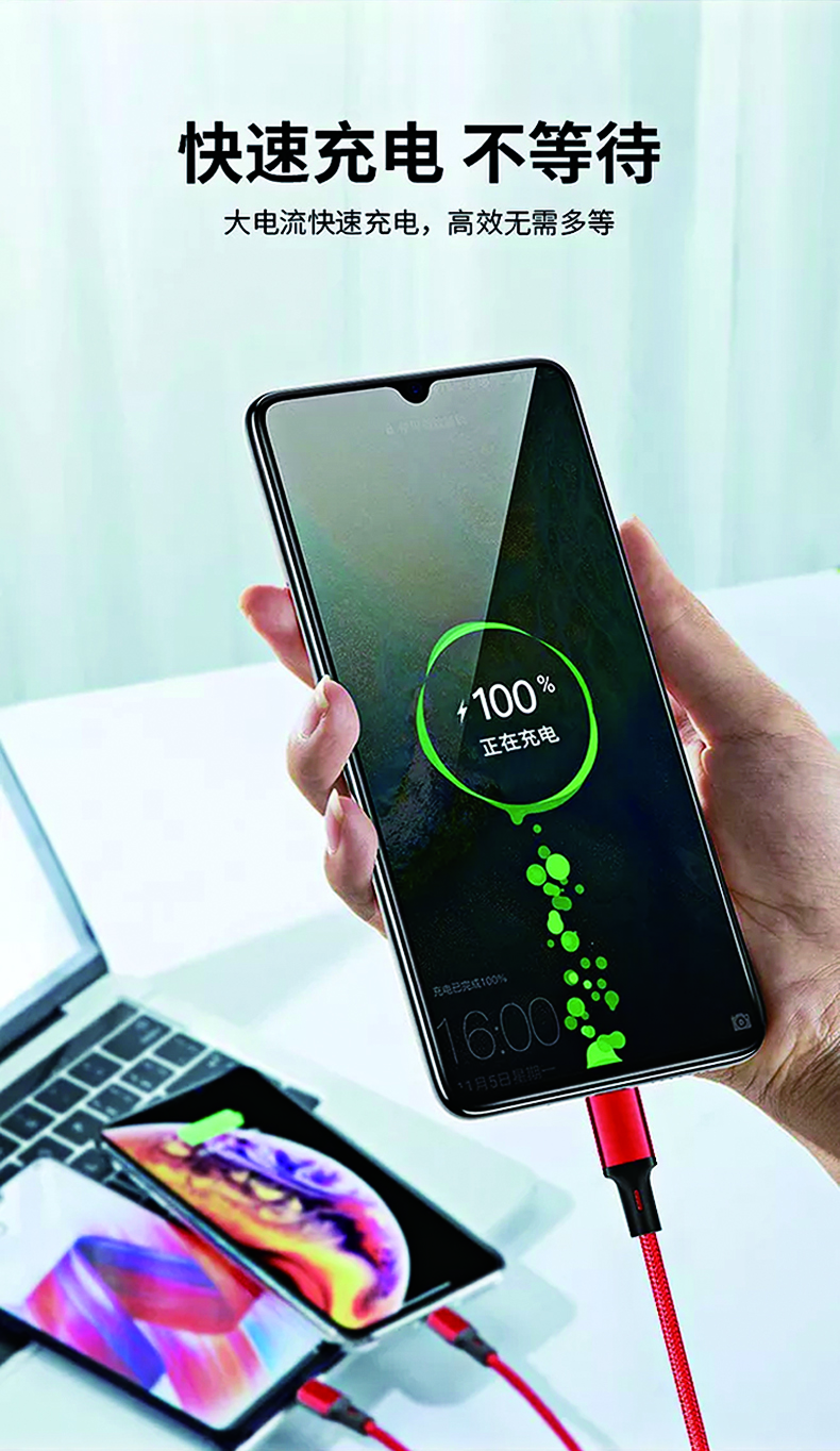 2 家庭环境:家庭中不同品牌设备(如苹果手机、安卓平板、Type-C笔记本)共用一条线充电,减少充电器数量