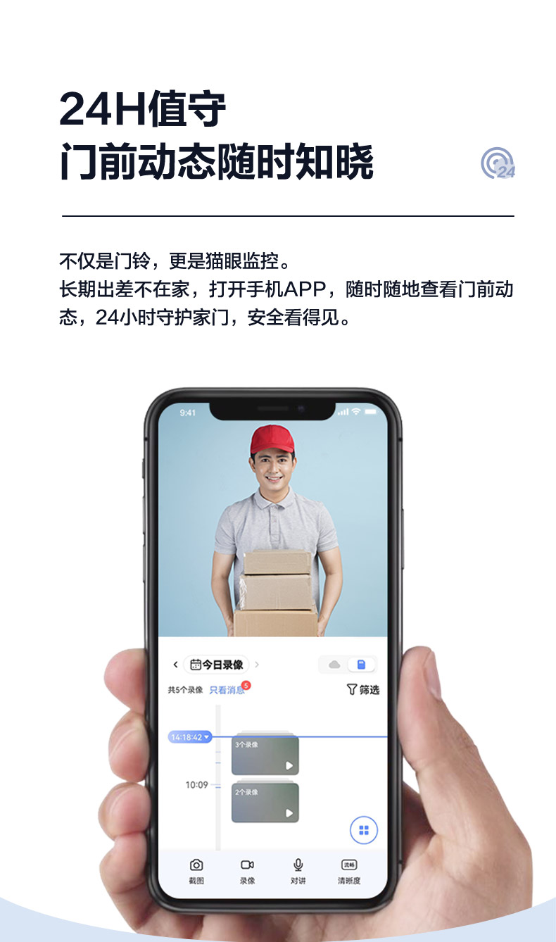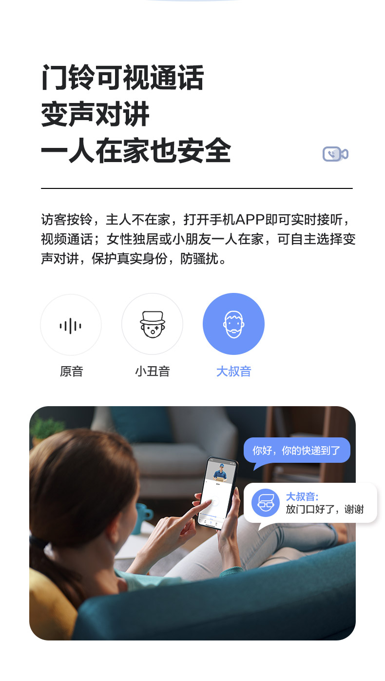 可视变声对讲功能,支持原音、小丑音、大叔音切换,保护独居者隐私