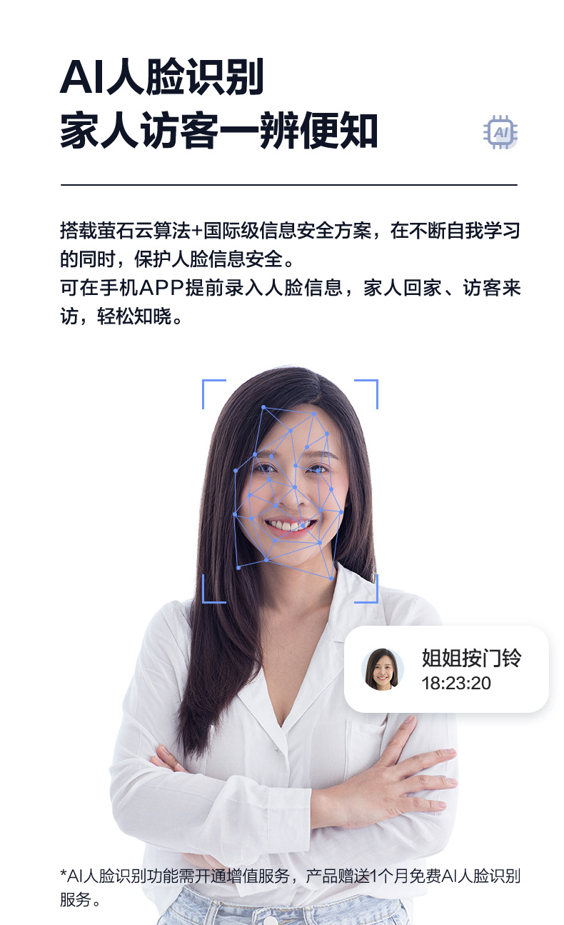 AI人脸识别,可提前录入人脸信息,识别家人或访客(需开通增值服务)