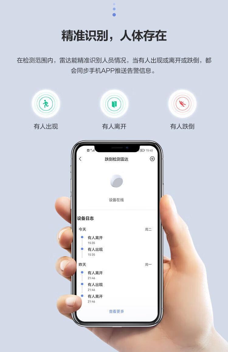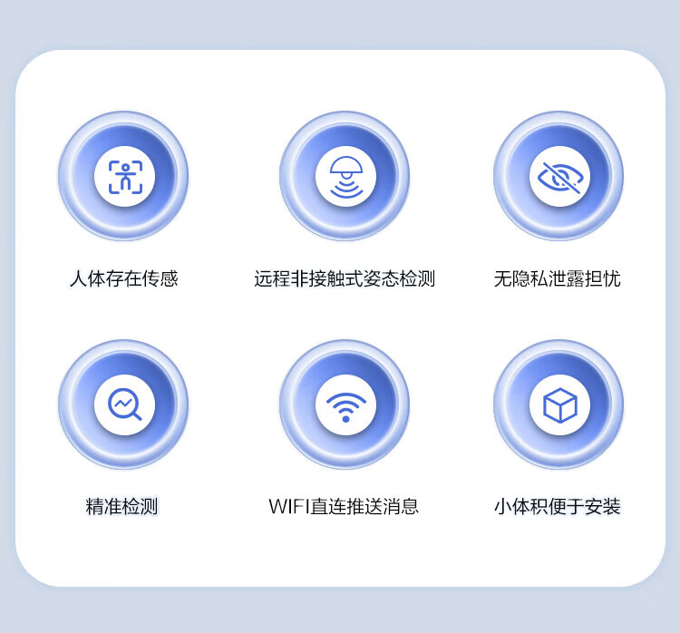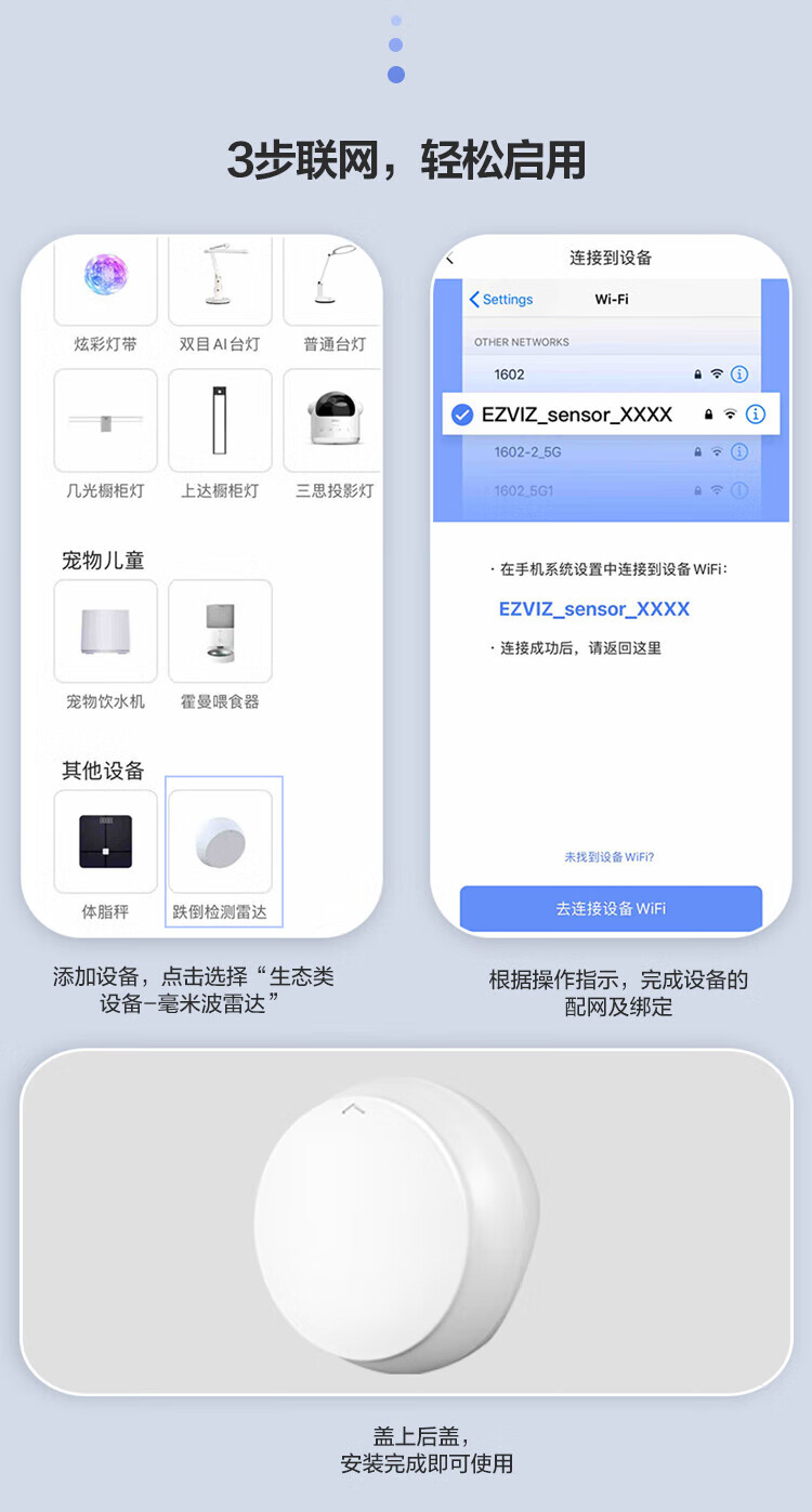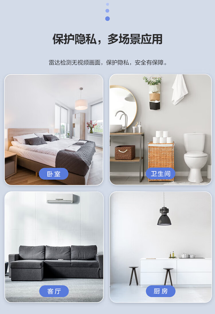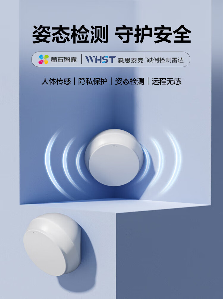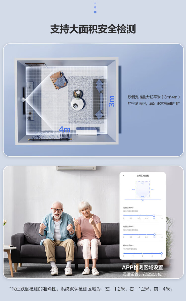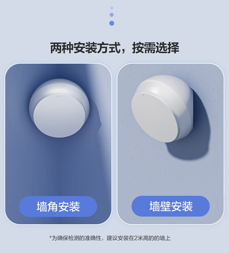 安装与使用便捷:小体积设计,支持墙角和墙壁两种安装方式,建议安装在2米高的墙上;3步即可完成联网启用,检测区域可灵活设置(默认左1.2米、右1.2米、前4米)