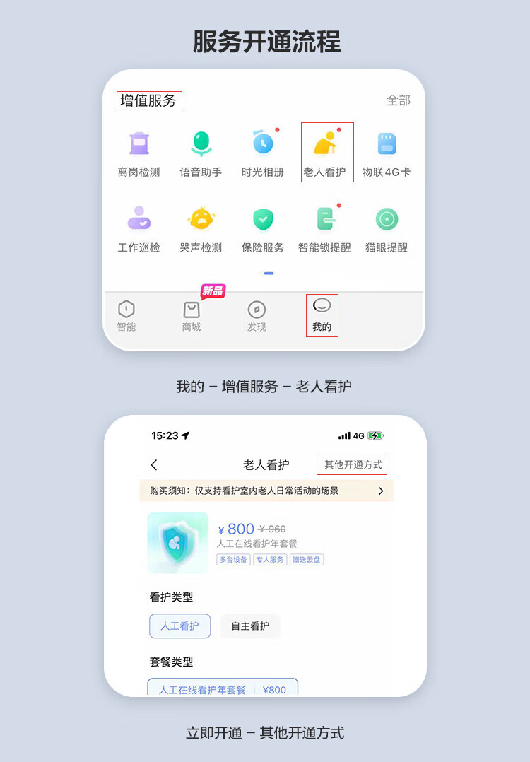 远程看护功能:支持7×24小时快速电话通知,提供自主看护和人工看护两种模式;自主看护模式下设备告警时直接电话通知用户/家人,人工看护模式下由在线看护人员复核后通知紧急联系人