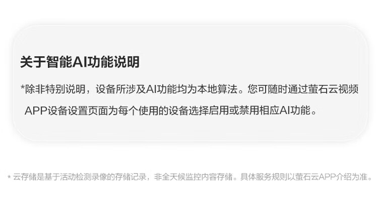 隐私保护:无视频画面采集,采用本地AI算法,用户可通过萤石云视频APP自主启用或禁用AI功能,保障隐私安全