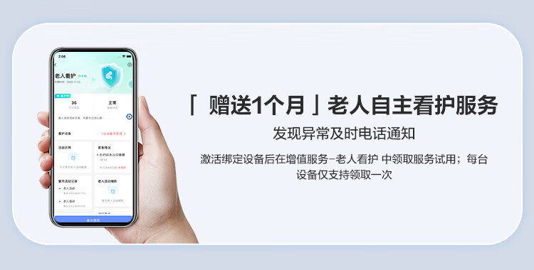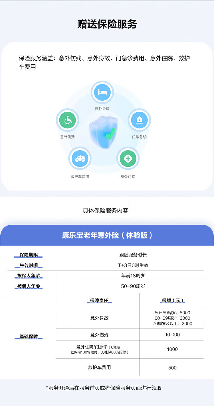 智能辅助功能:包含活动记录统计(可查看全天活动时长、次数、最早/最晚活动时间)、赠送康乐宝老年意外险(体验版,覆盖意外伤残、身故、门急诊等责任)、WiFi直连推送消息