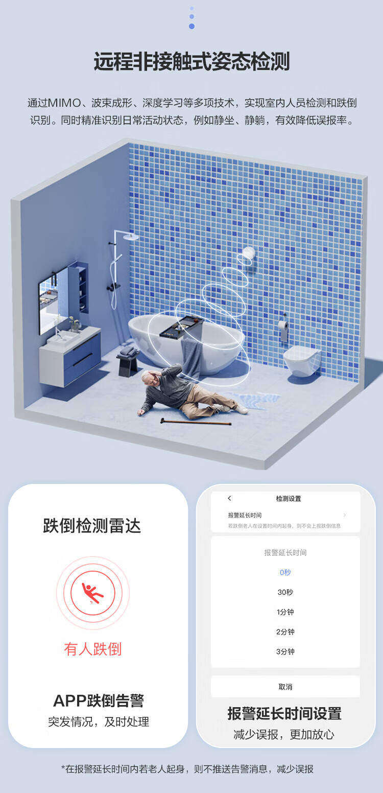 雷达跌倒检测:采用森思泰克跌倒检测雷达,通过MIMO、波束成形、深度学习技术实现室内人员检测与跌倒识别,支持最大12平米(3m×4m)检测面积,能精准识别有人出现、离开或跌倒状态,有效降低误报率