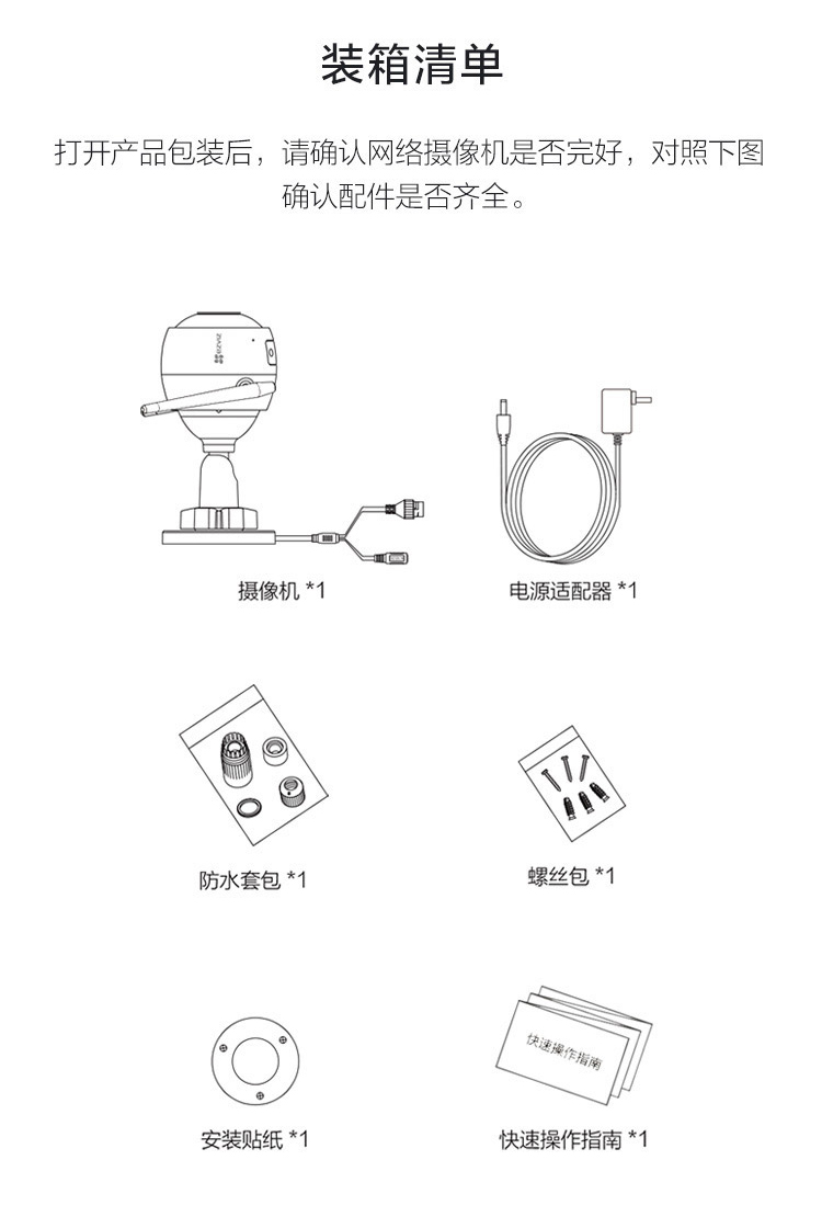 1 安装前确认配件齐全(摄像机、电源适配器、防水包、螺丝包等),选择合适的安装位置(避免镜头遮挡,确保WiFi信号稳定,远离水源直接喷射处)