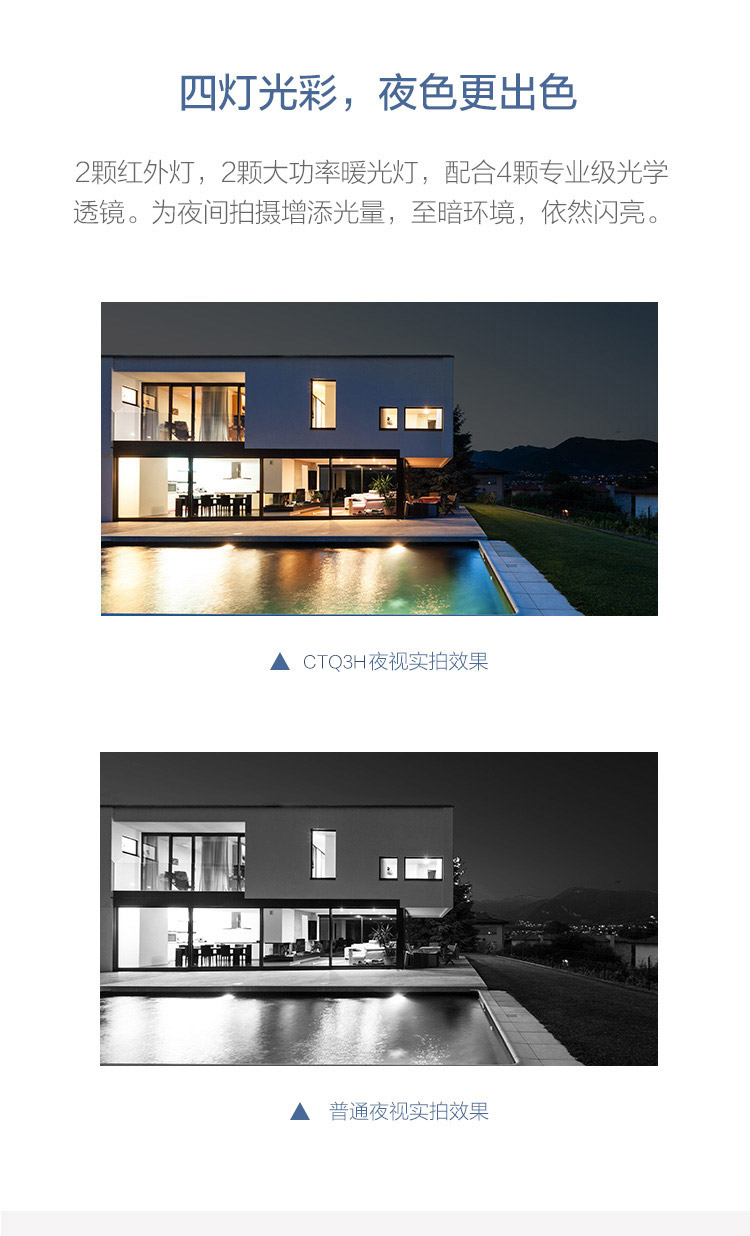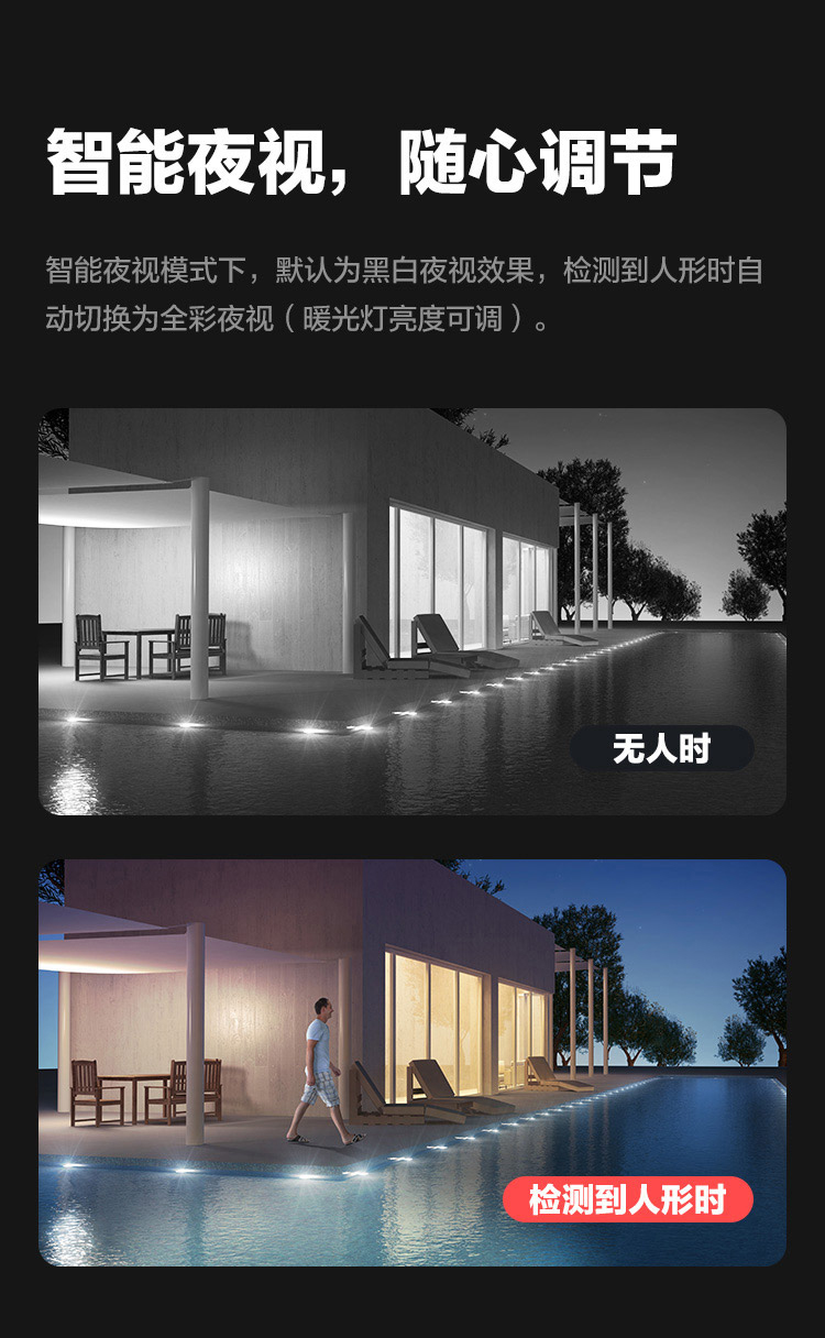 3 夜视能力:4灯光彩设计(2颗红外灯+2颗暖光灯),支持智能夜视切换(默认黑白,检测到人形自动全彩,暖光灯亮度可调),也可手动切换全彩/黑白模式,夜间监控效果出色