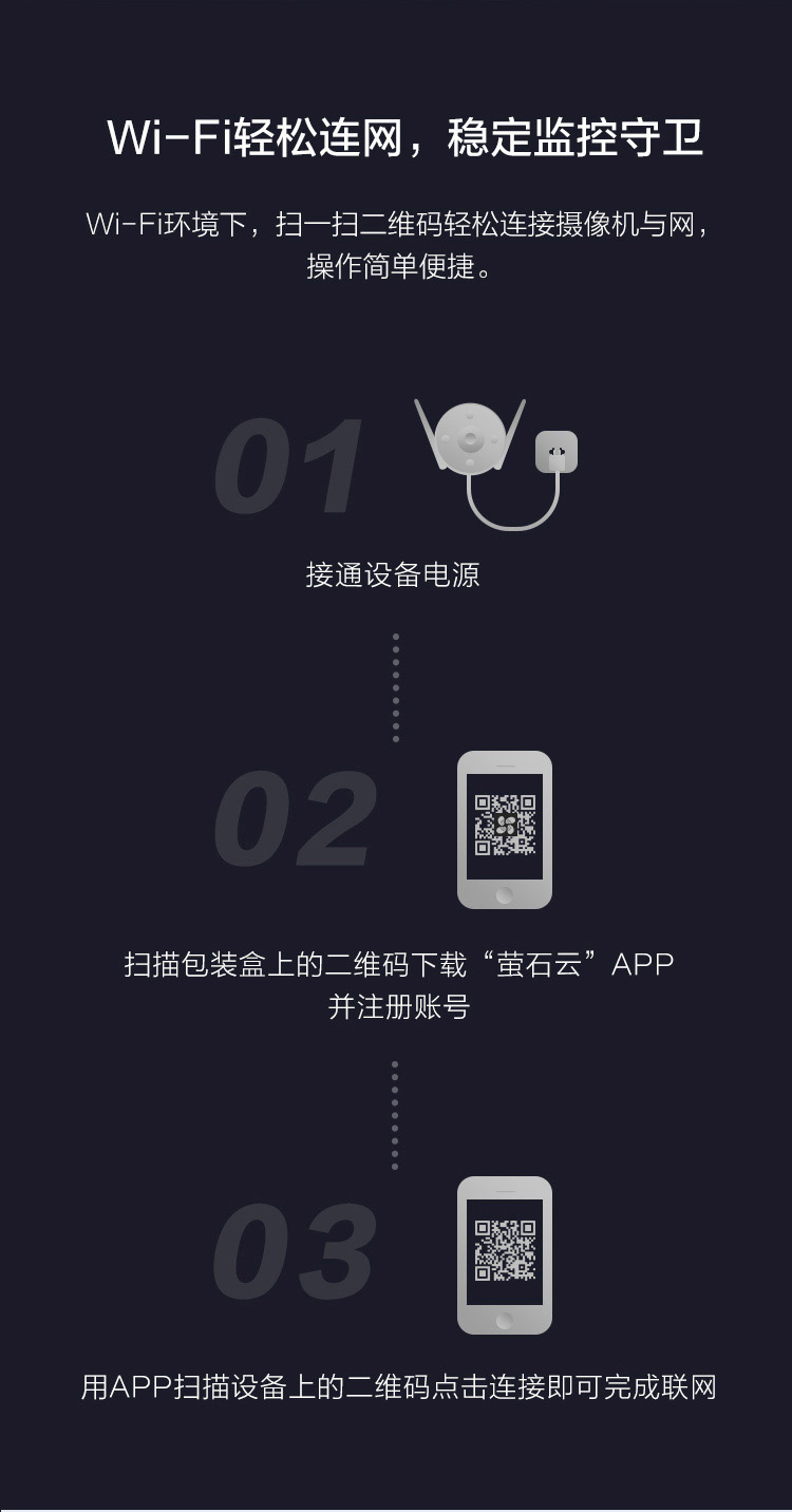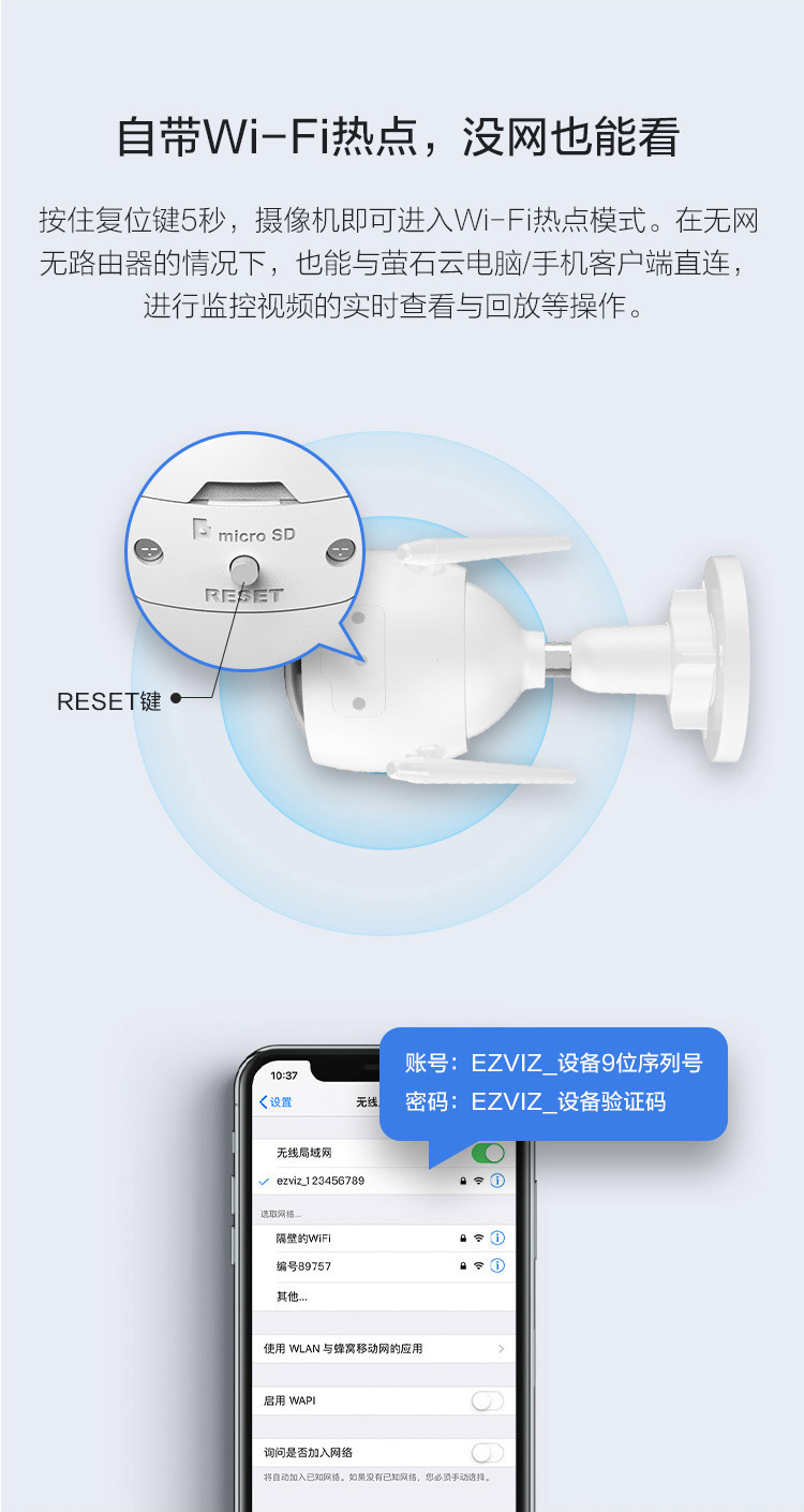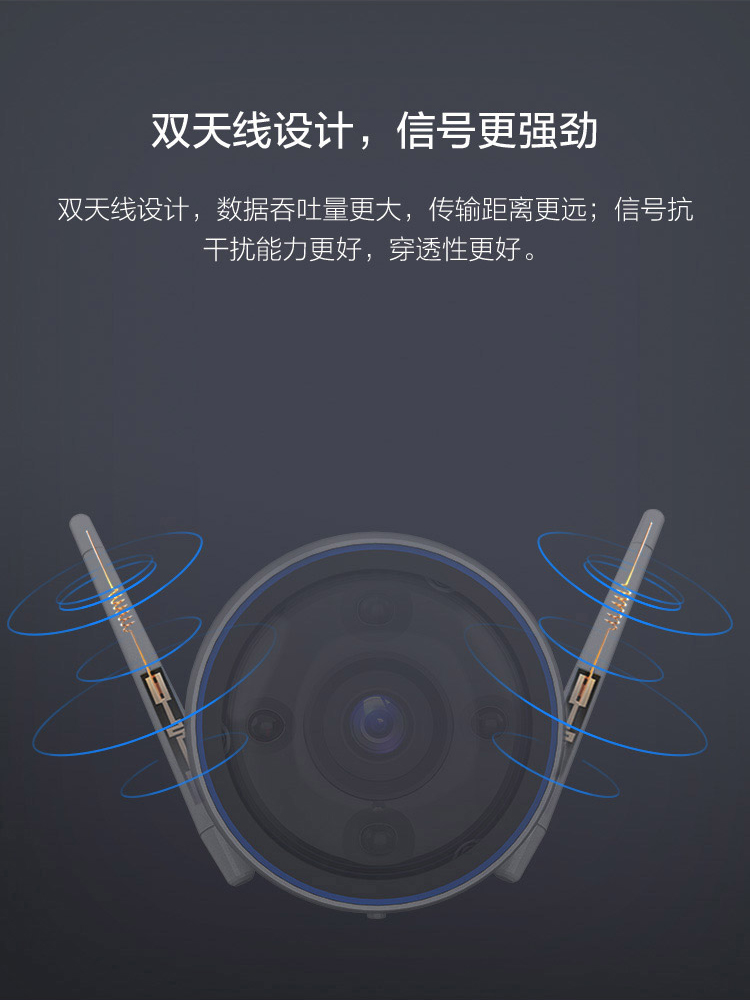 5 网络与连接:双天线设计,信号抗干扰强、传输距离远;支持WiFi轻松联网(扫码即可),无网时可开启自带WiFi热点,与萤石云客户端直连查看
