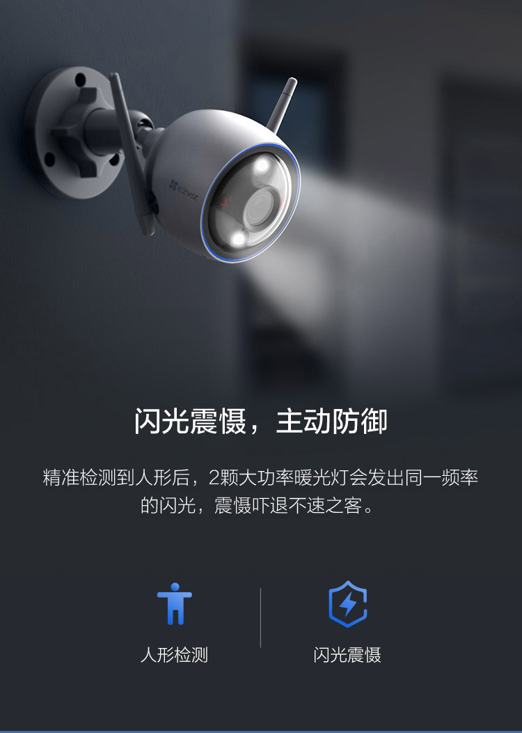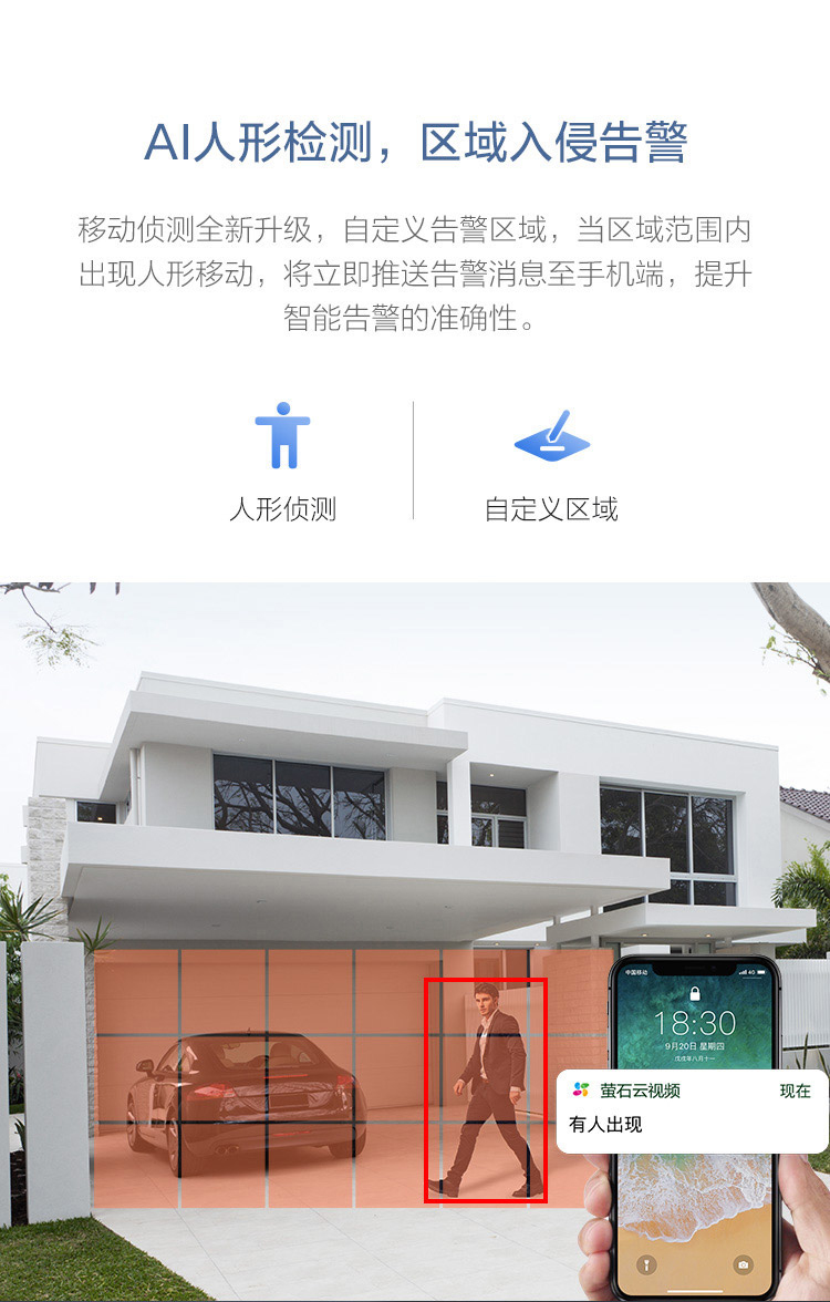 2 智能检测与告警:AI人形检测功能,可自定义告警区域,区域内有人形移动时推送手机告警;检测到人形后触发2颗大功率暖光灯闪光震慑,主动防御