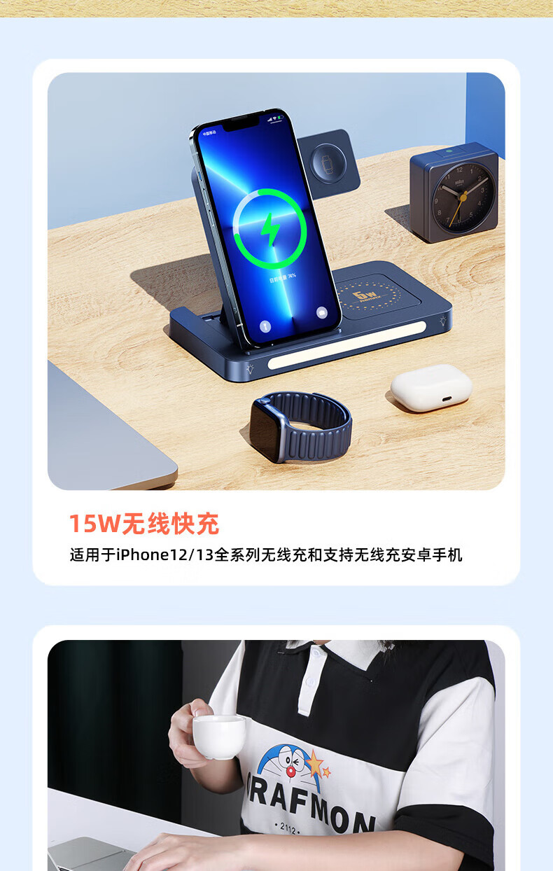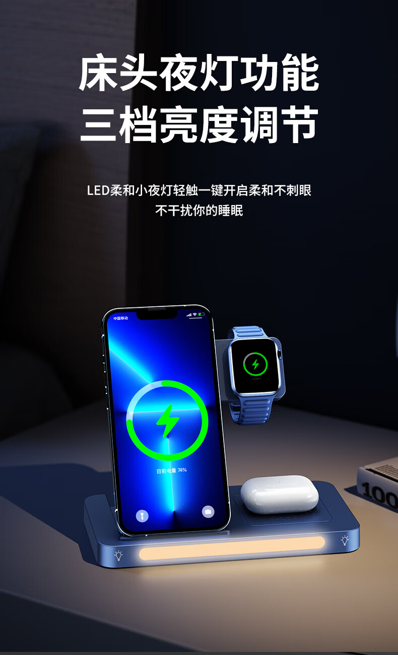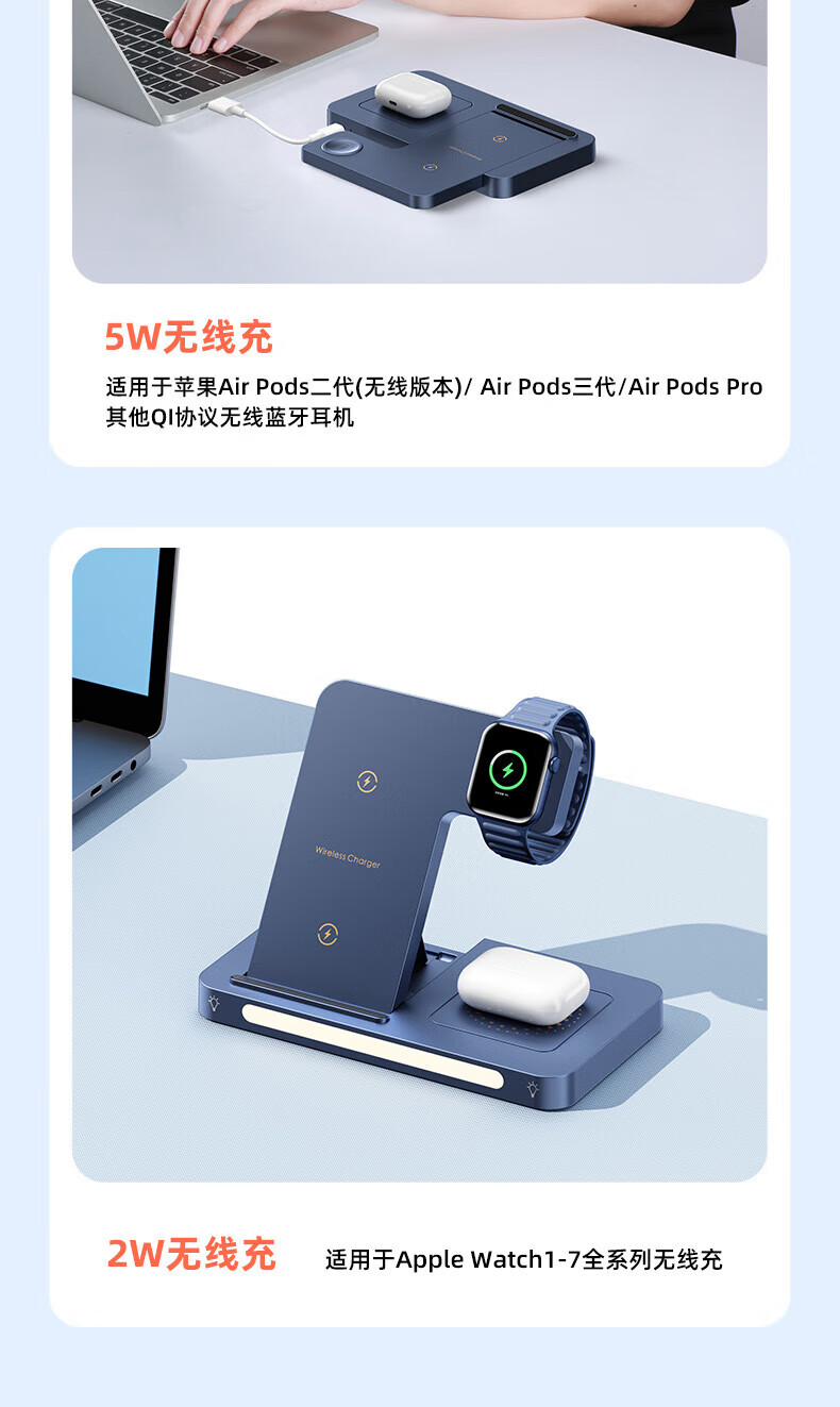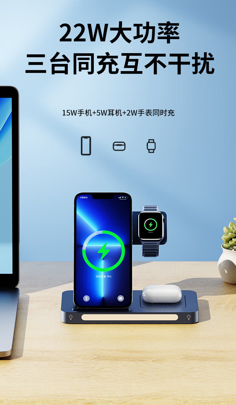 三合一多功能设计:支持手机(15W)、手表(2W)、无线耳机(5W)同时无线充电,总功率22W,多设备充电互不干扰