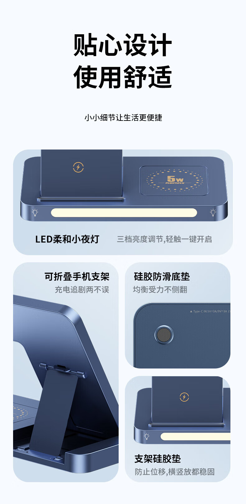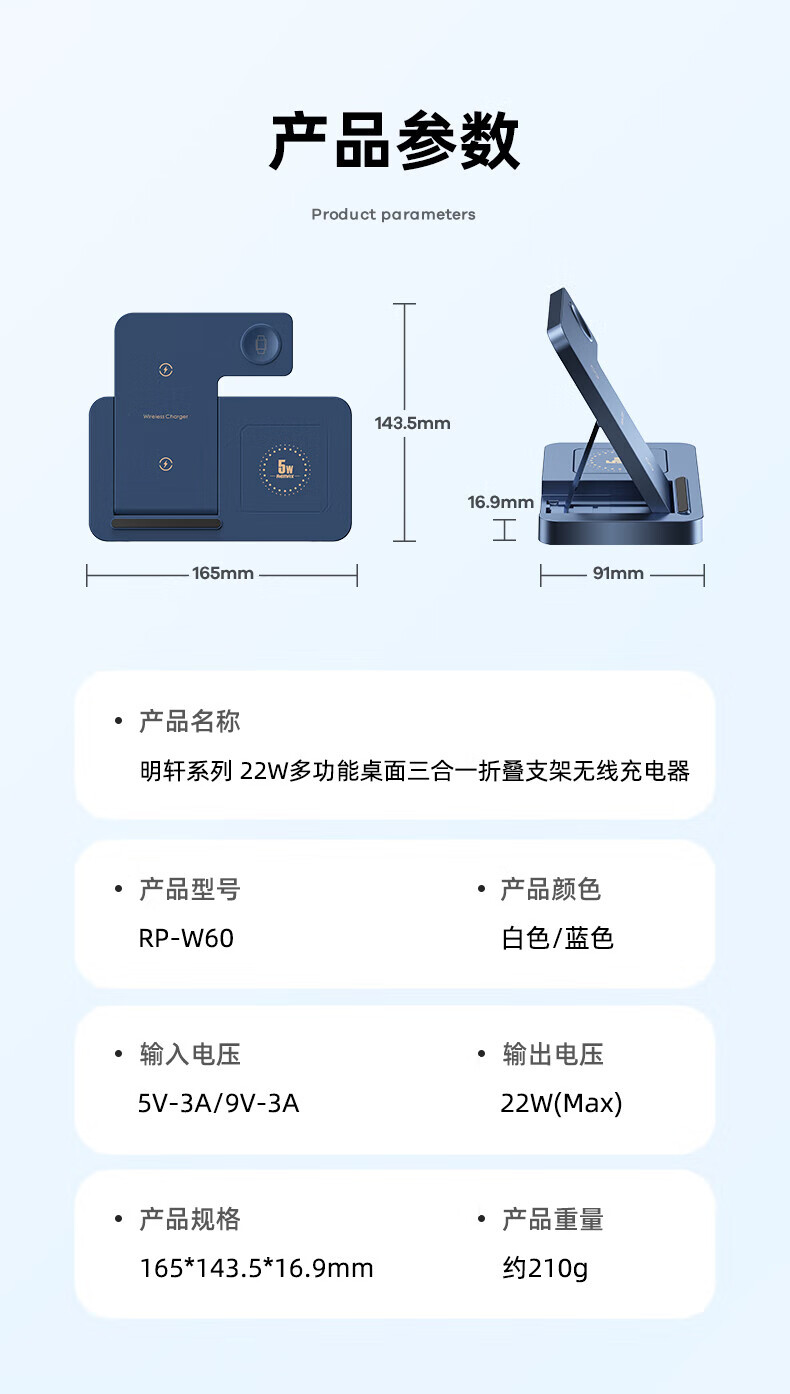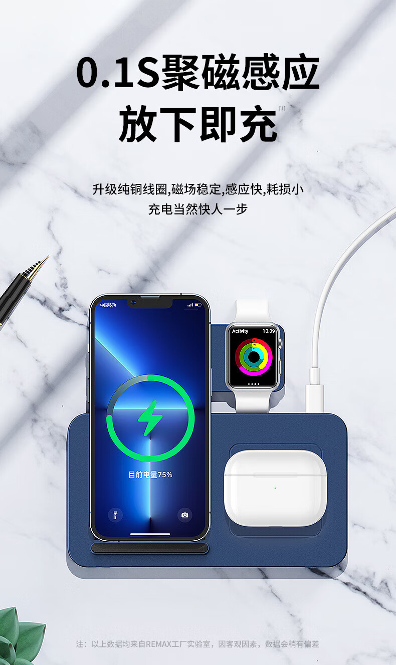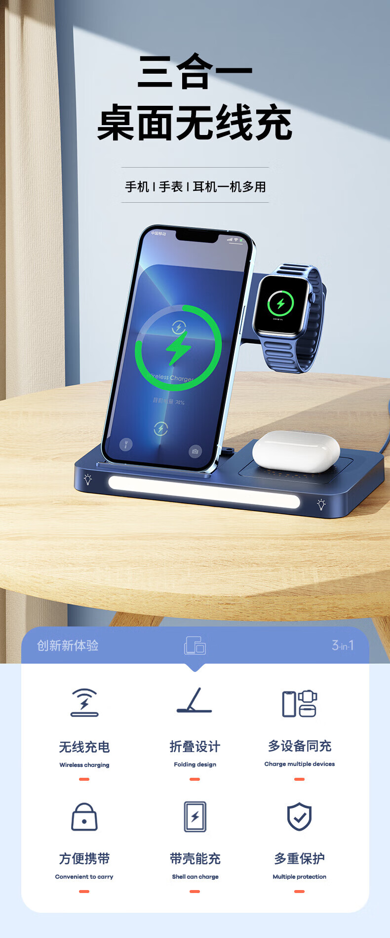 三合一多功能设计:支持手机(15W)、手表(2W)、无线耳机(5W)同时无线充电,总功率22W,多设备充电互不干扰
